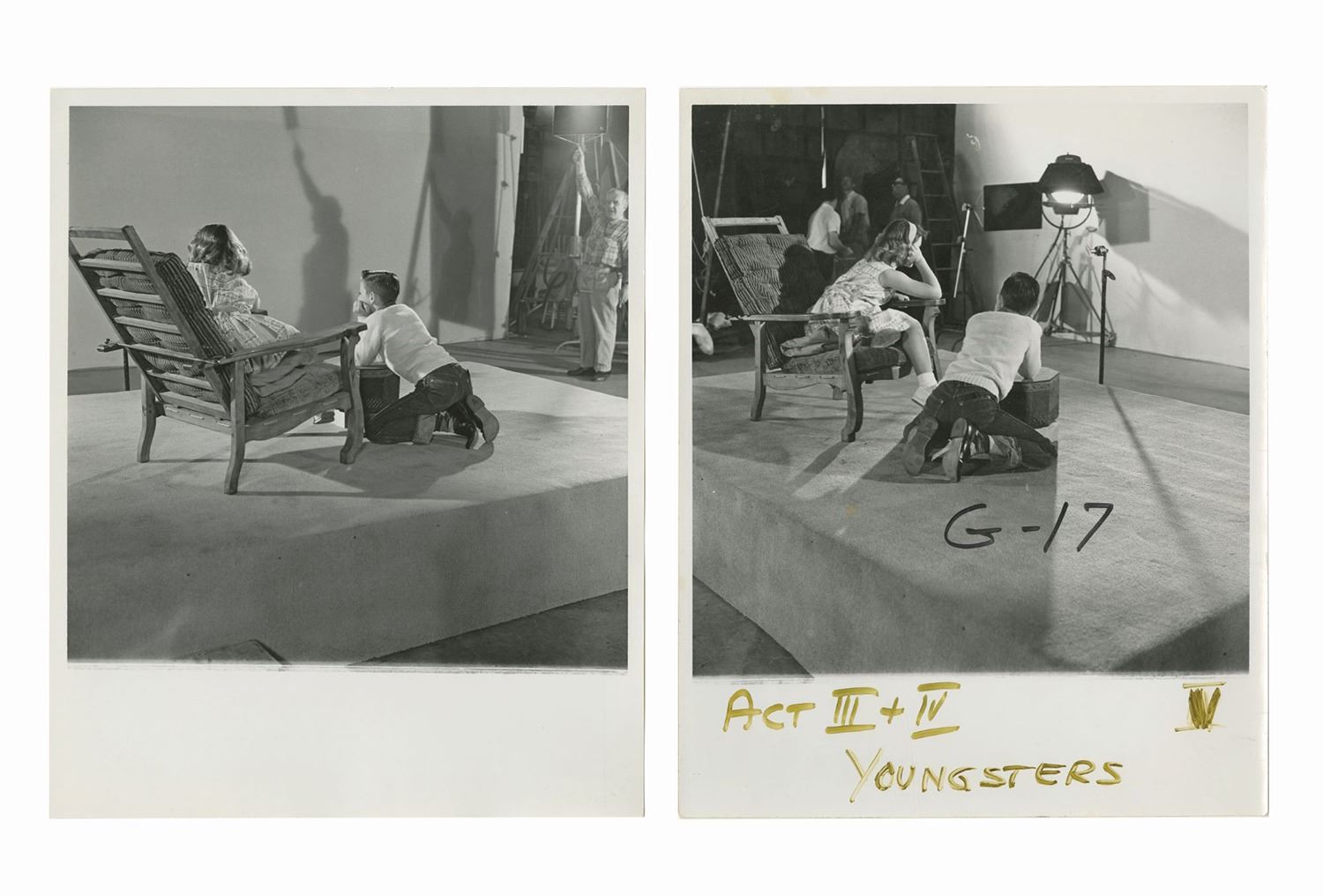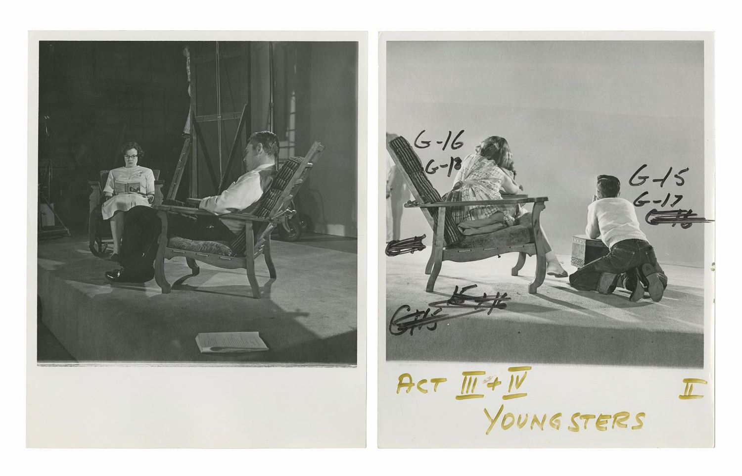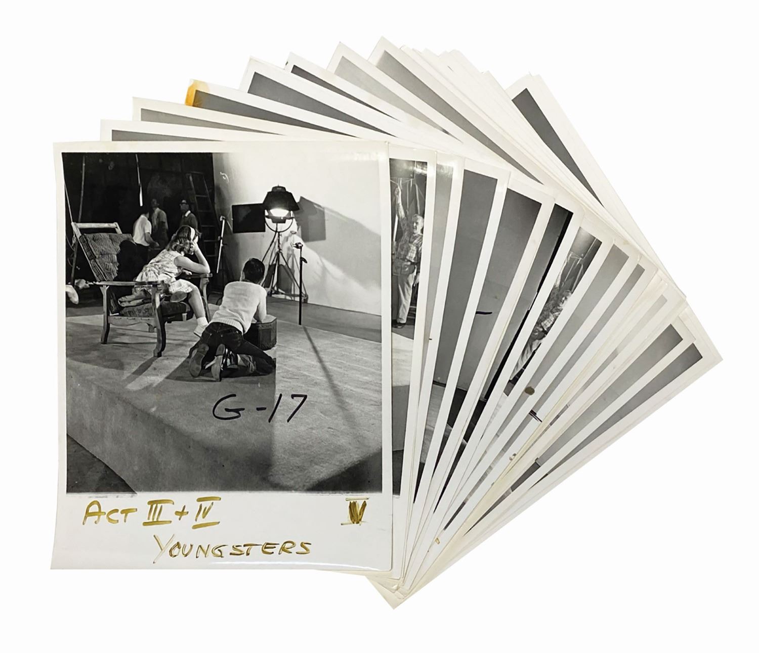 (World's Fair/Disneyland, c.1963) An incredibly rare set of (21) black and white Imagineering reference photos used in the creation of Walt Disney's Carousel of Progress. To help determine the proper lighting and positioning of the animatronic characters, live actors were used and photographed as reference. These photos were taken in 1963 for the original version seen at the 1964-65 New York World's Fair. Following the World's Fair, the attraction was moved to Disneyland, and later to Walt Disney World. These photos provide a fascinating look into this iconic attraction, and depict several live actors standing in place for the animatronics seen in the 1940s Third Act. Each photo measures approximately 10"x8" and the condition is good with some handling wear and areas of discoloration from use. Many of the photos have original pencil reference numbers written on the reverse.