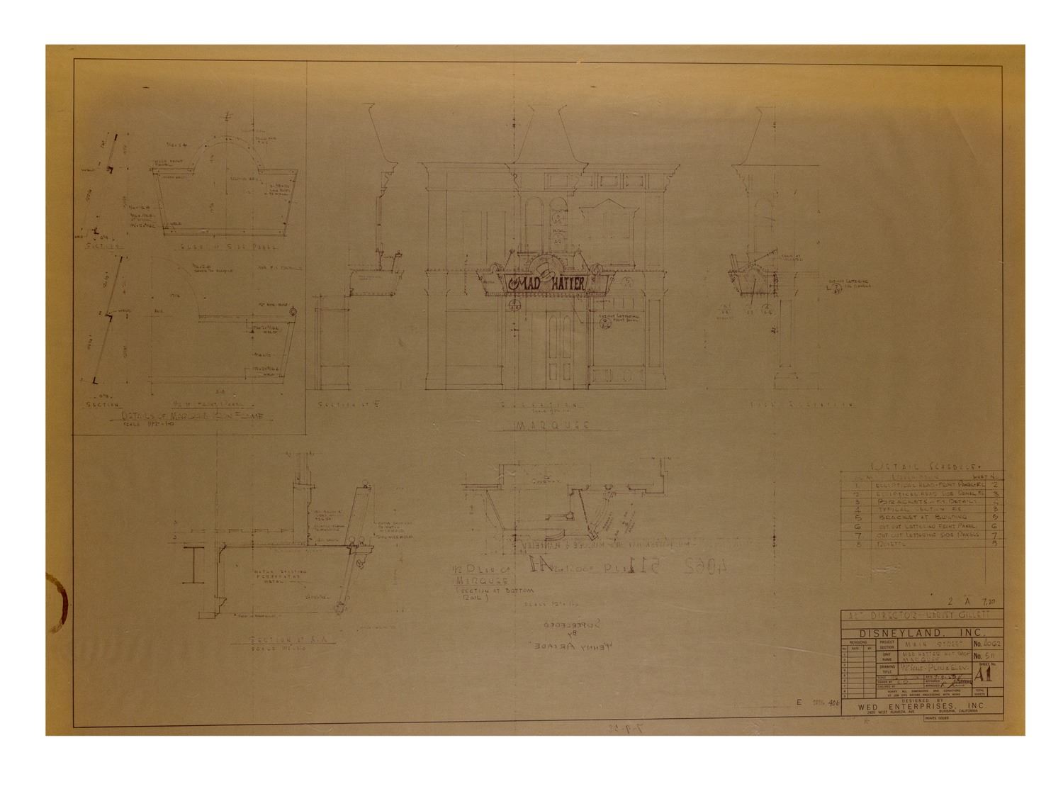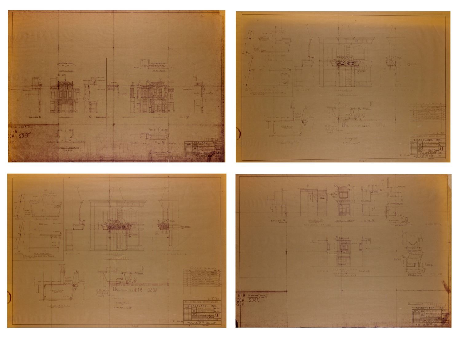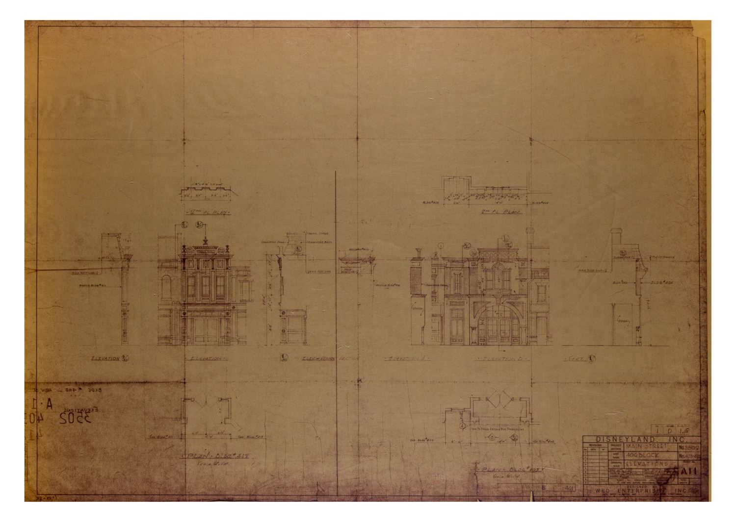 (Disneyland, c.1970s-80s) A collection of (24) construction brownlines featuring details for the buildings in the "400 Block" of Main Street at Disneyland. The "400 Block" has been the home to the Penny Arcade, Candy Palace, Carnation Ice Cream Plaza, Coca-Cola Refreshment Corner, and more. These brownlines feature the original imagery dated in the 1950s, although they were most likely used during the 1970s and 1980s. These brownlines measure 30"x42". This set is in very good condition overall, with spots of edge-wear to some of the brownlines from use.