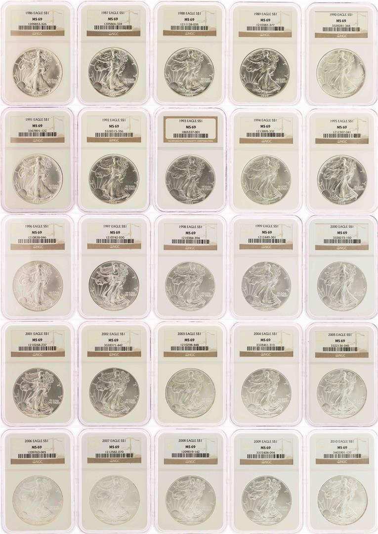 Set of (25) 1986-2010 $1 American Silver Eagle Coins NGC MS69