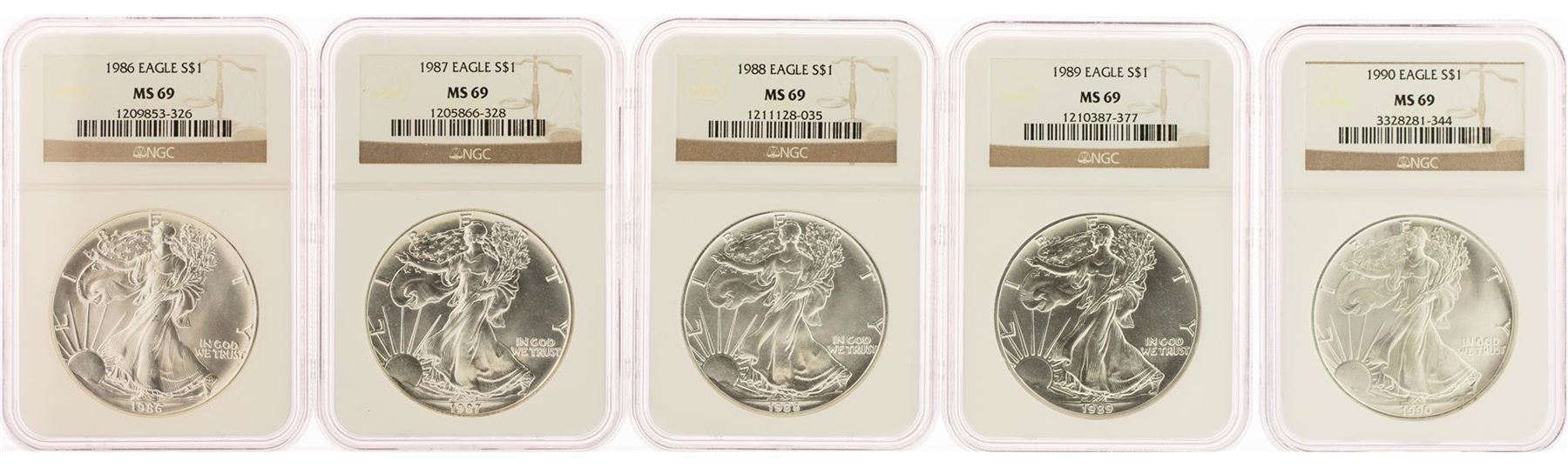 One Set of (25) 1986-2010 $1 American Silver Eagle Coins NGC MS69. NGC Certified.