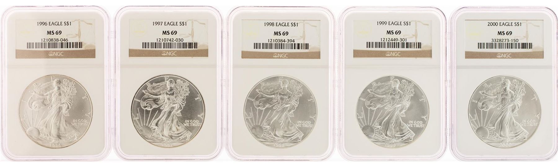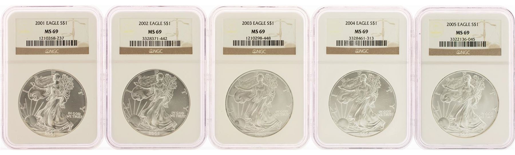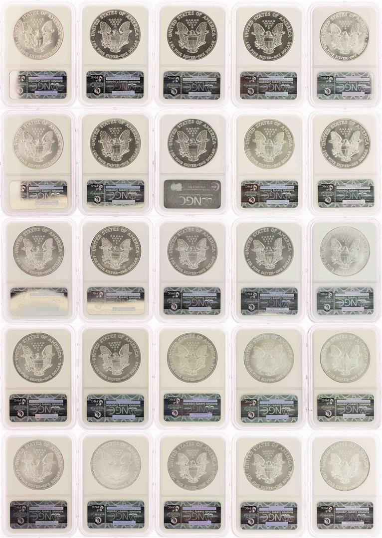 One Set of (25) 1986-2010 $1 American Silver Eagle Coins NGC MS69. NGC Certified.