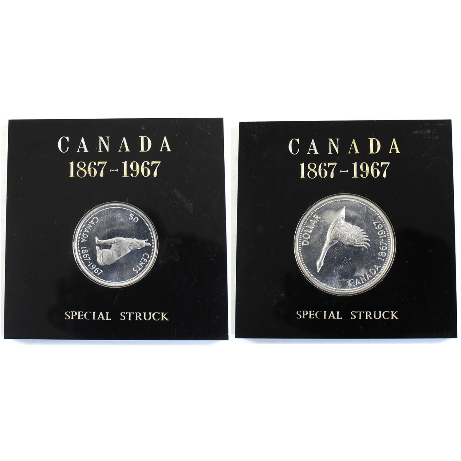 Set of 2x 1967 Commemorative Coins. Lot includes a Silver $1 and a 50-cent. Coins are Proof-Like and come in an attractive black acrylic case. 2pcs