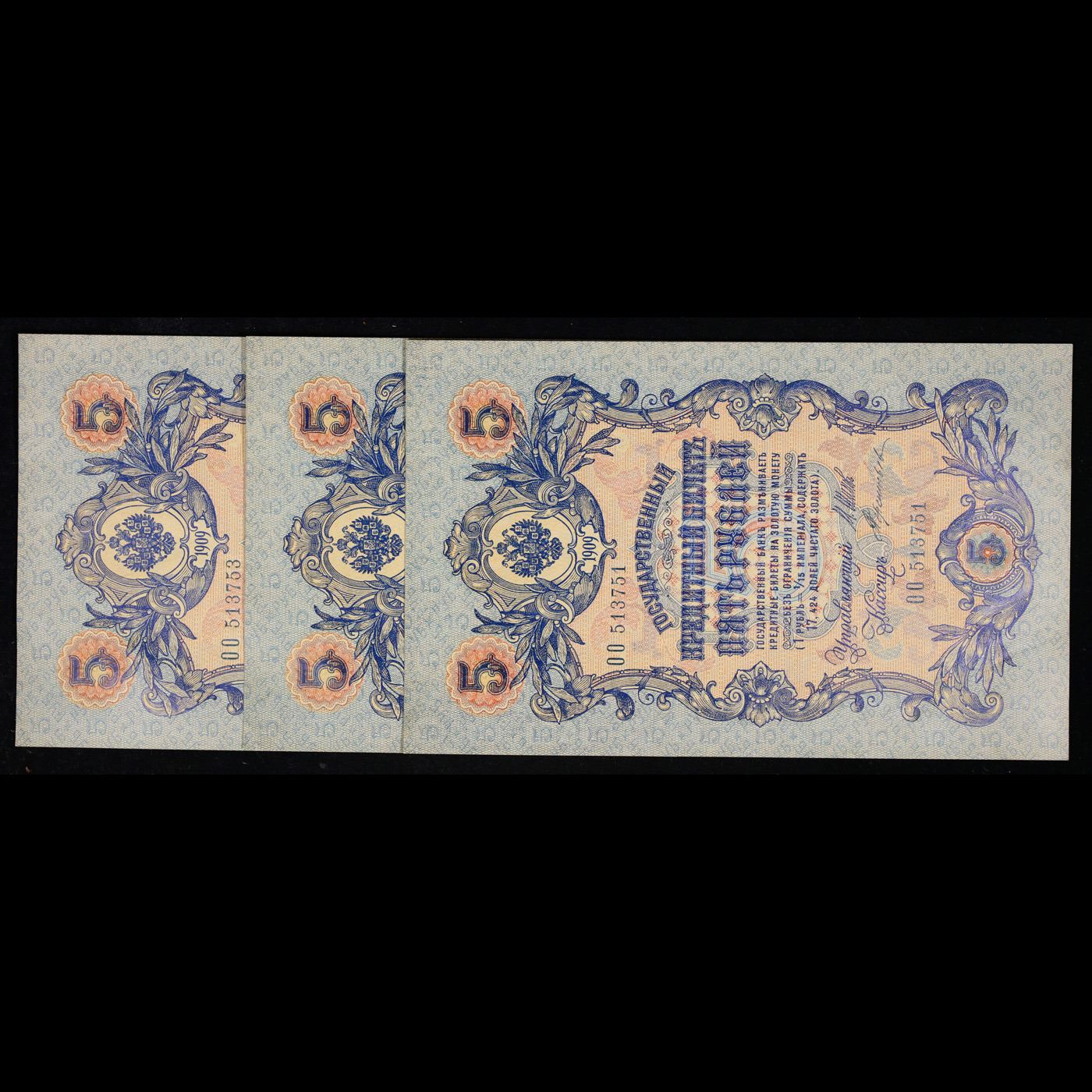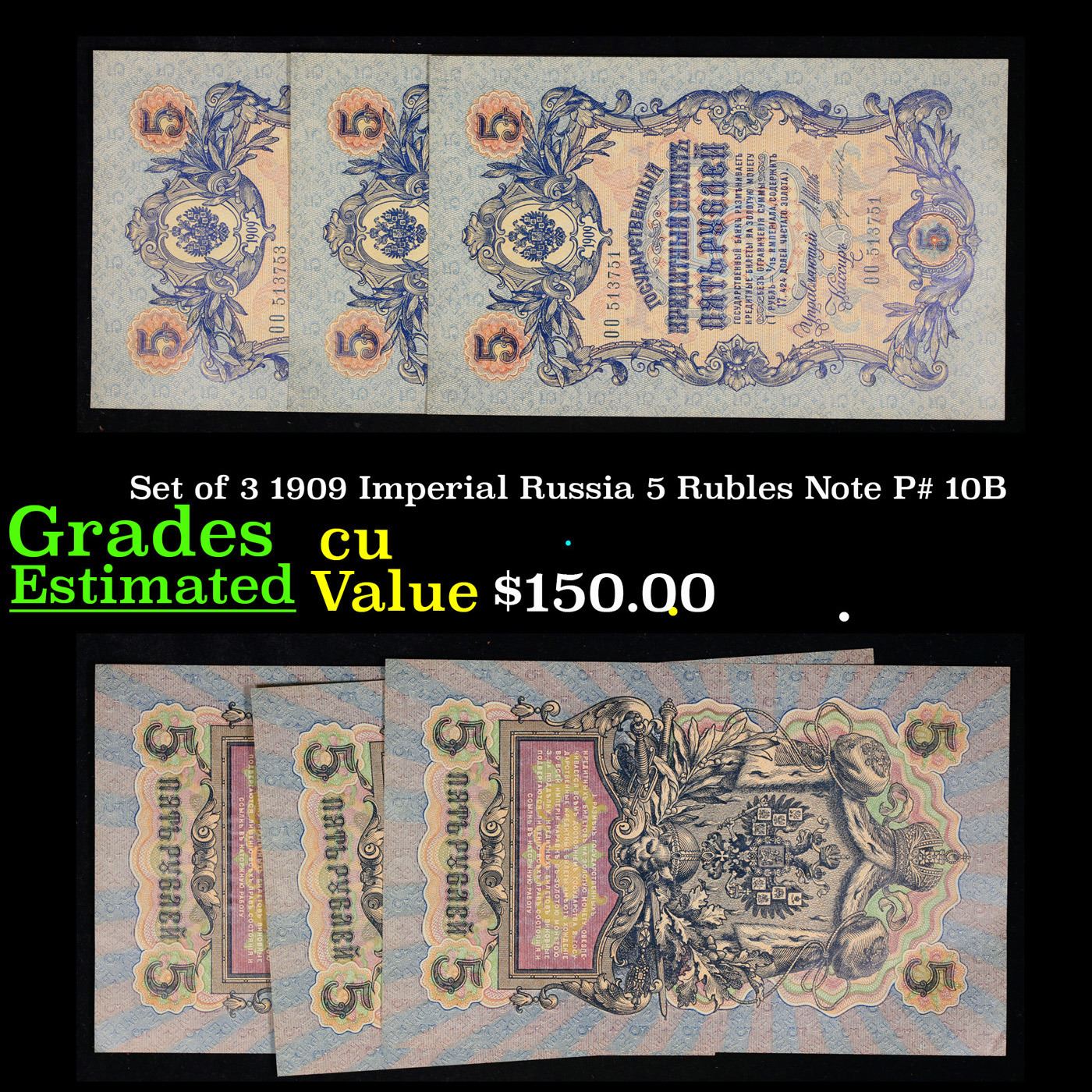 Set of 3 1909 Imperial Russia 5 Rubles Note P# 10B Grades CU.