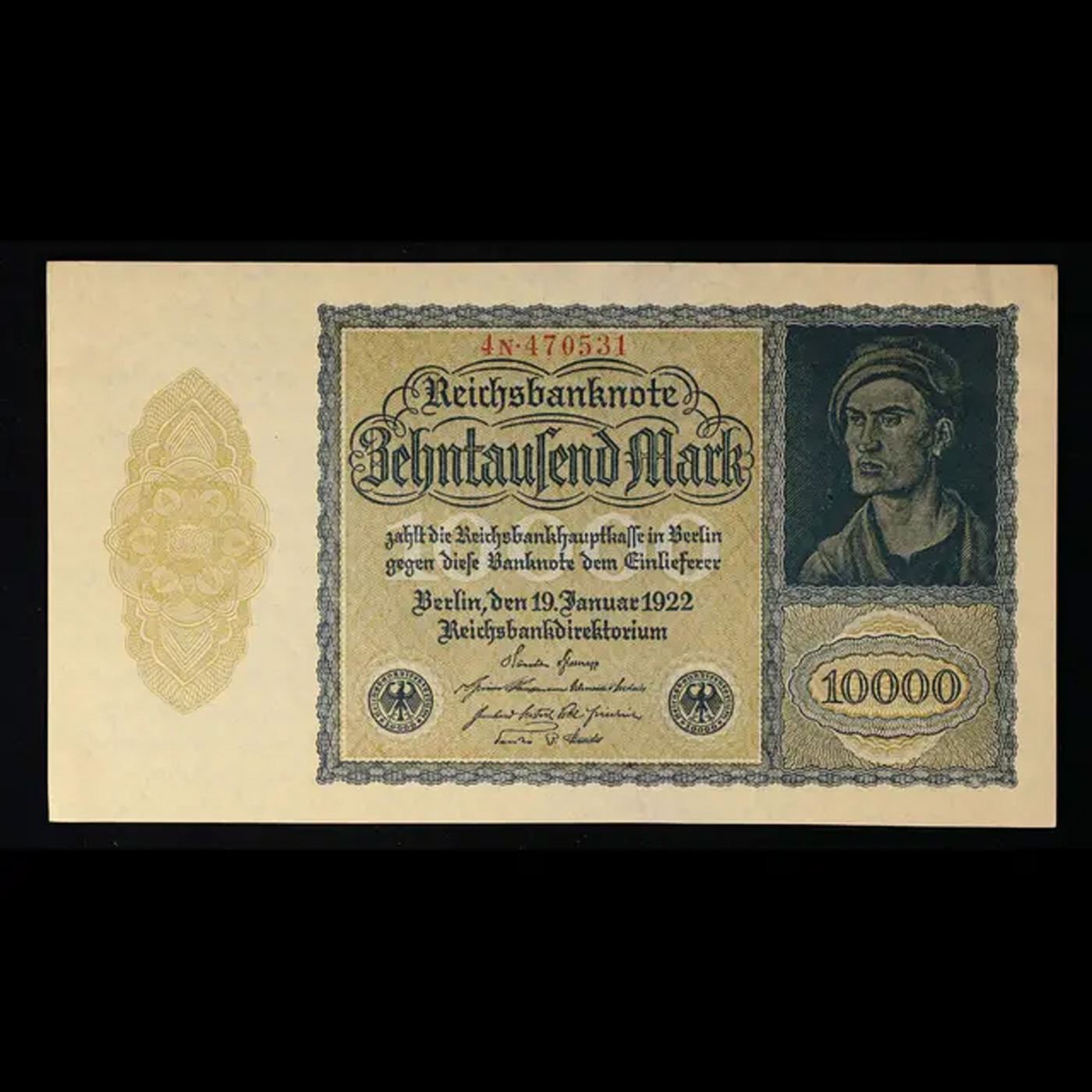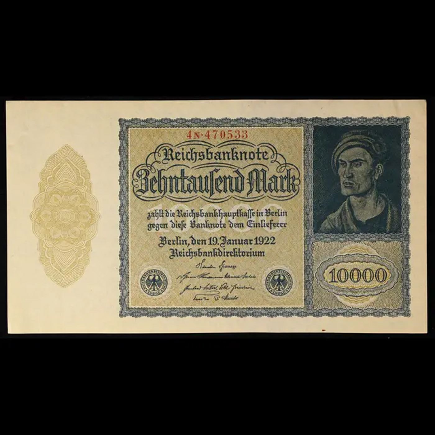 Set of 3 1922 Weimar Germany 10,000 Mark Vampire Notes P# 71 Grades CU. Among the many bills issued during the hyperinflation crisis in the post-WWI German Weimar Republic, the "Vampire Note" is a particular standout. It is known as the Vampire Note because when the note's engraver (identity unknown) adapted a portrait by famous German Renaissance painter Albrecht Durer for the note, he made an odd alteration where the neck of the figure looks like a Vampire when the bill is rotated 90 degrees. It takes some imagination to see, but was intentional and meant to represent the anti-French sentiment in WWI Germany -- France was considered to be "sucking the life out of" the country following the signing of the Treaty of Versailles. The Reichsbank noticed this alteration, but did not change it, printing several varieties of the bill with the design and giving credence to the popular anti-French sentiment. There are three varieties, Pick # 70 and 71 differing in the reverse design, and Pick # 72 being a smaller version of Pick # 71.