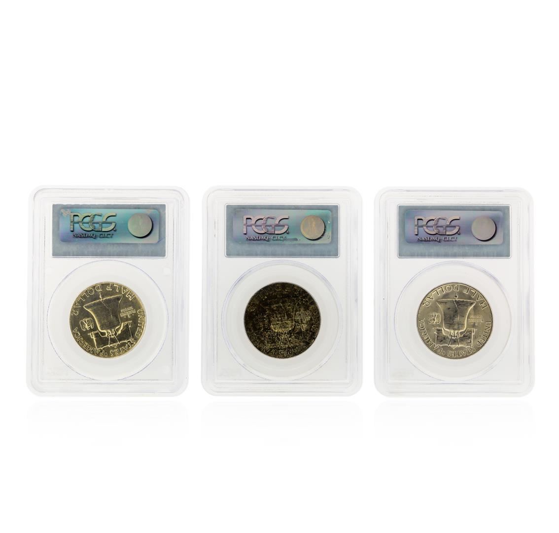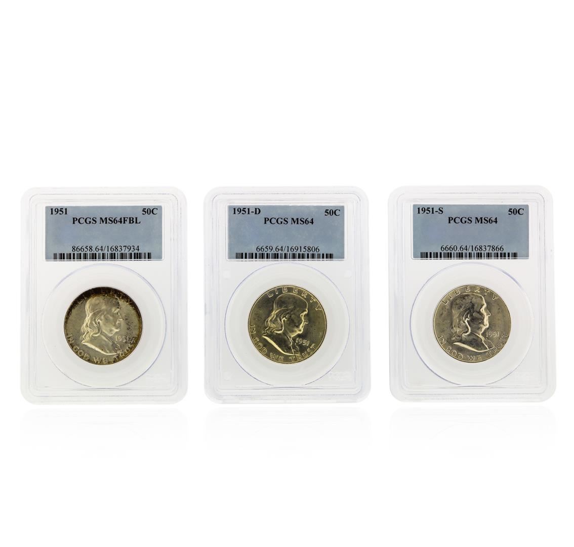 Set of (3) 1951 Franklin Half Dollar PCGS Graded Coins which includes the following (3) coins: (1) 1951 Franklin Half Dollar PCGS Graded MS64FBL, (1) 1951-D Franklin Half Dollar PCGS Graded MS64, and (1) 1951-S Franklin Half Dollar PCGS Graded MS64. PCGS Graded.