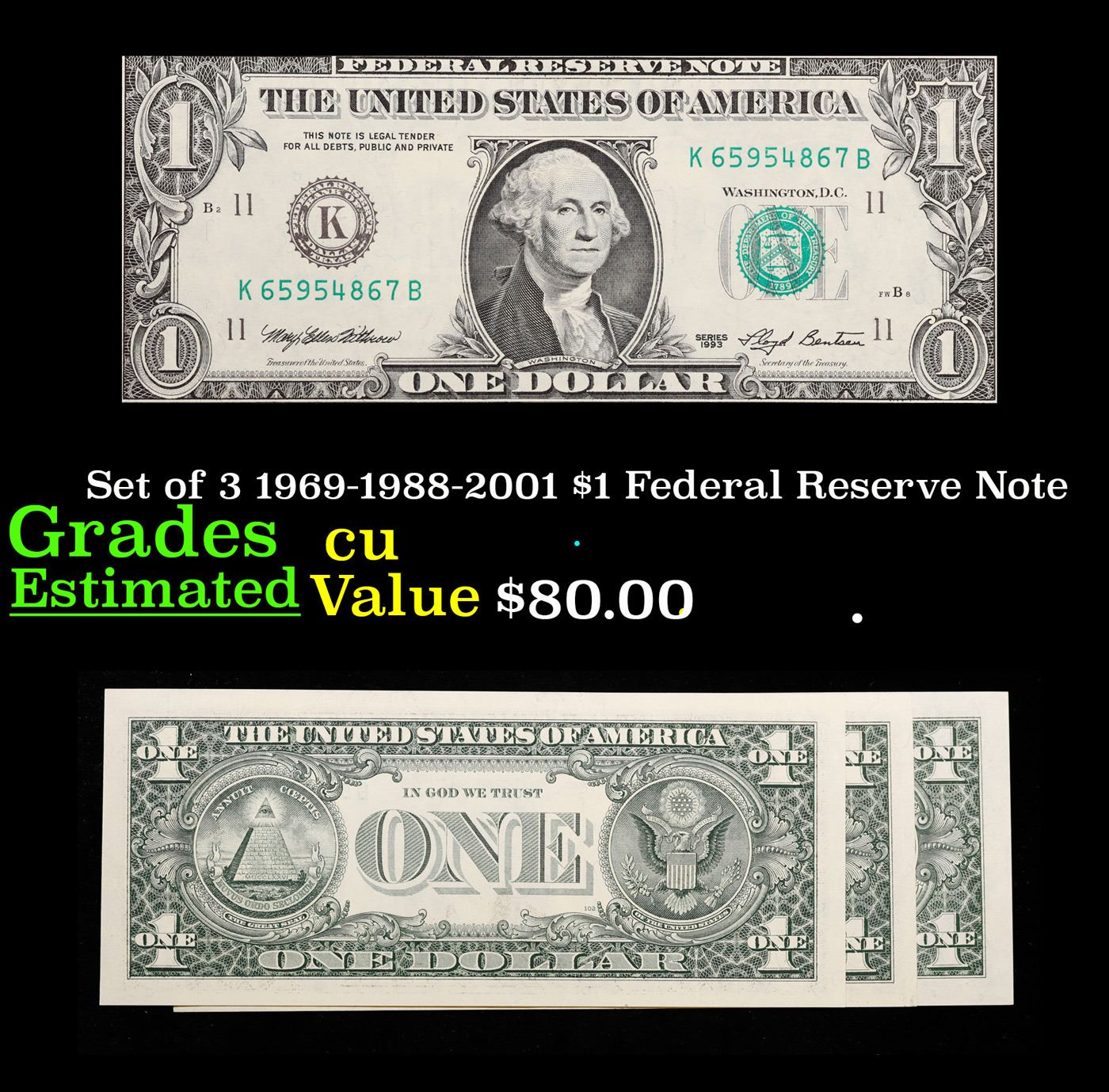 Set of 3 1969-1988-2001 $1 Federal Reserve Note Grades cu.