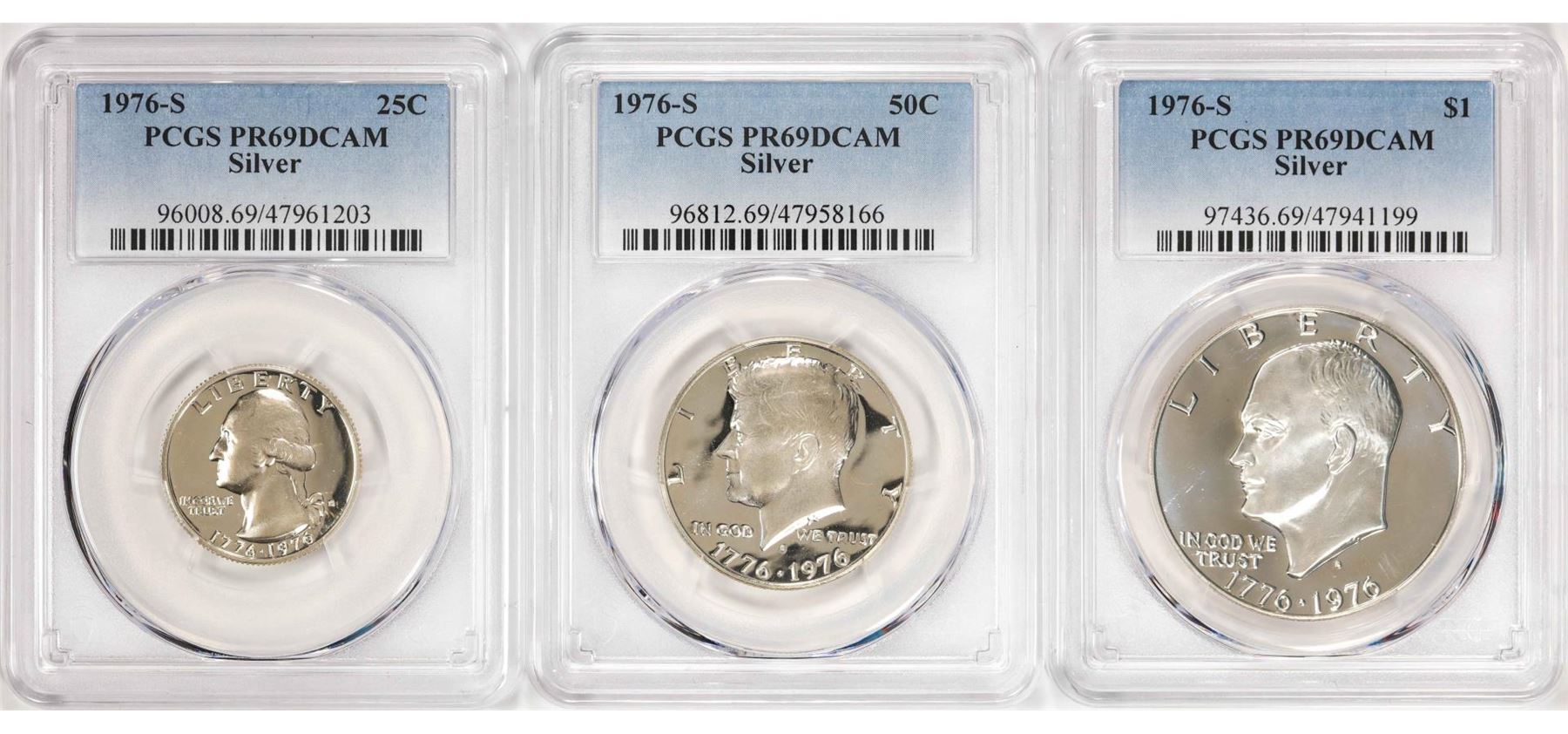 One Set of 3 1976-S Proof Quarter, Half Dollar, Eisenhower Dollar Silver Coins PCGS PR69DCAM. PCGS Graded.