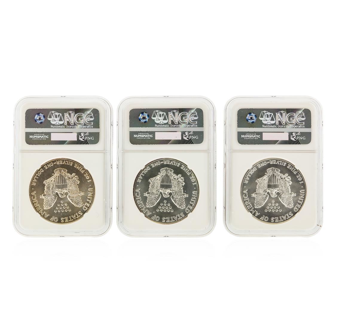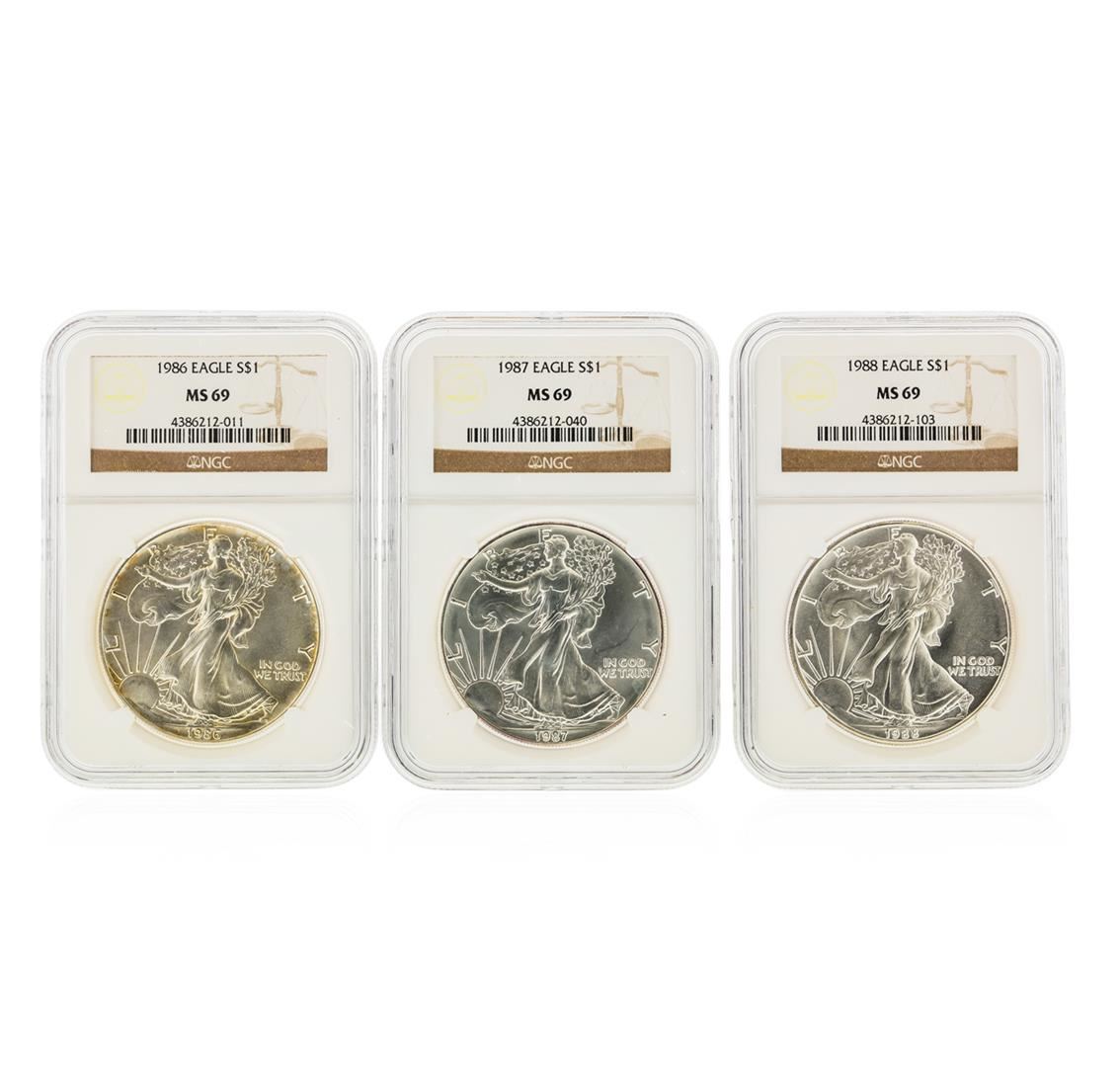 One Set of (3) 1986-1988 $1 Silver Eagle Coins NGC Graded MS69. NGC Certified.