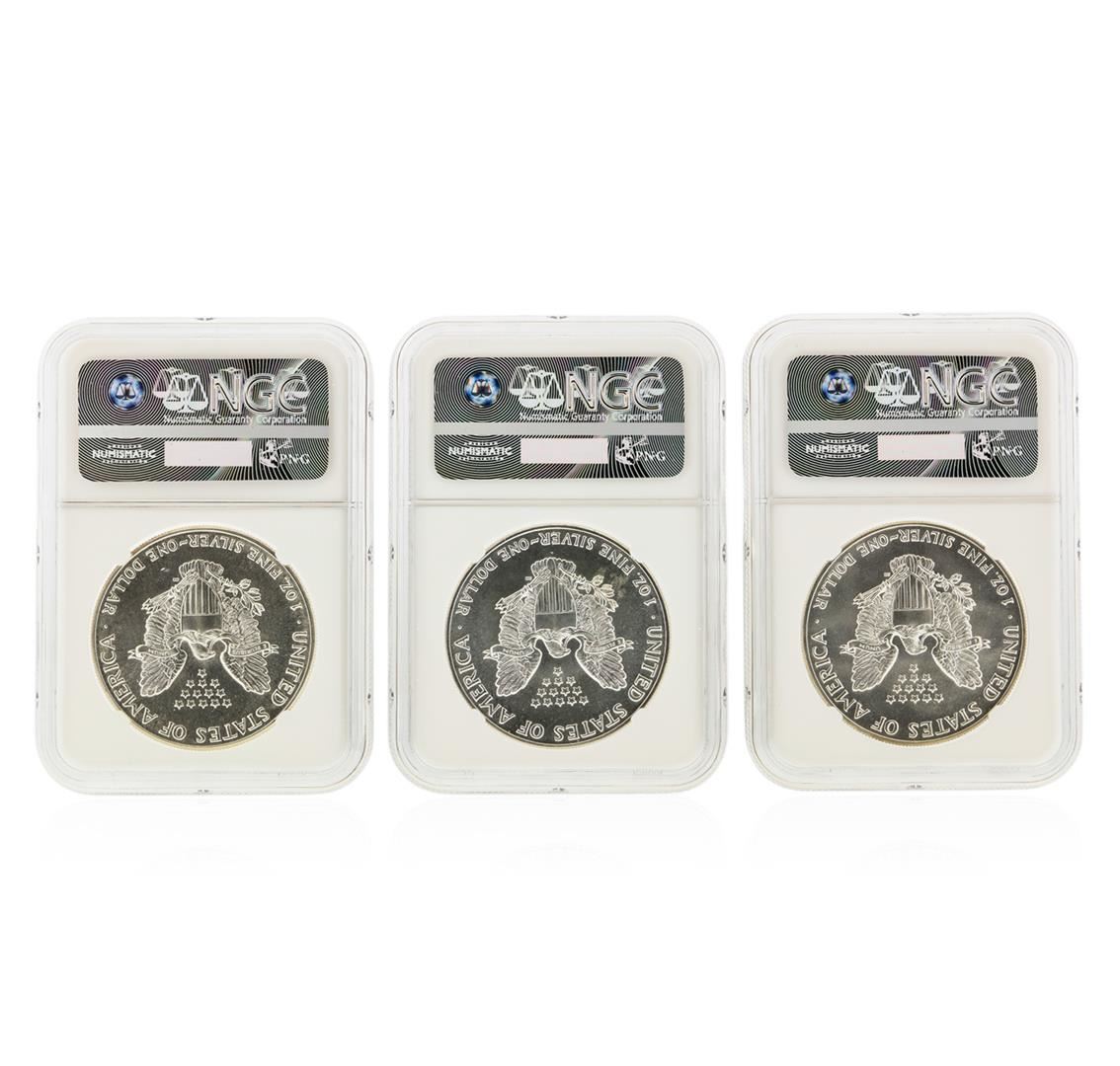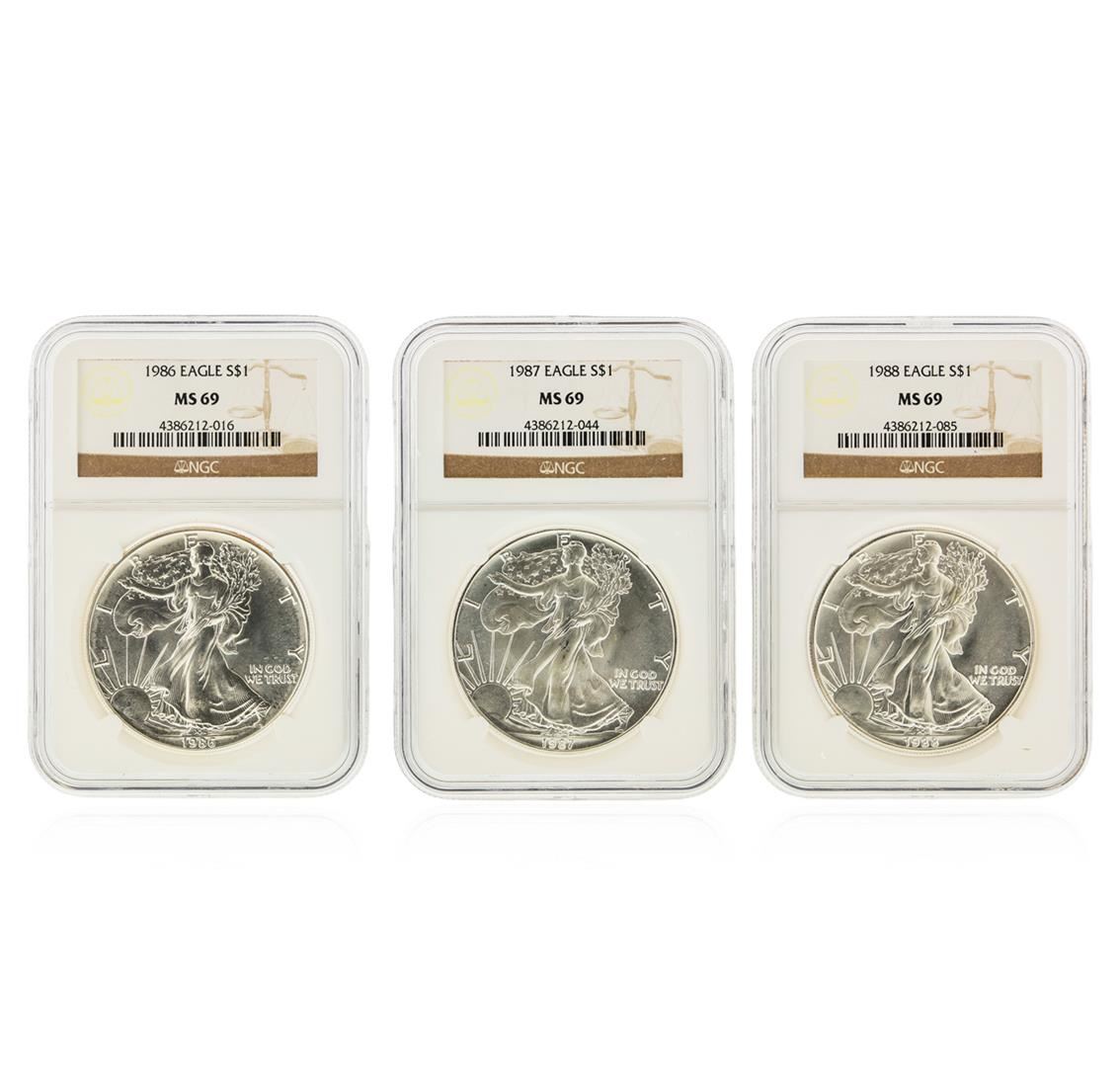 One Set of (3) 1986-1988 $1 Silver Eagle Coins NGC Graded MS69. NGC Certified.