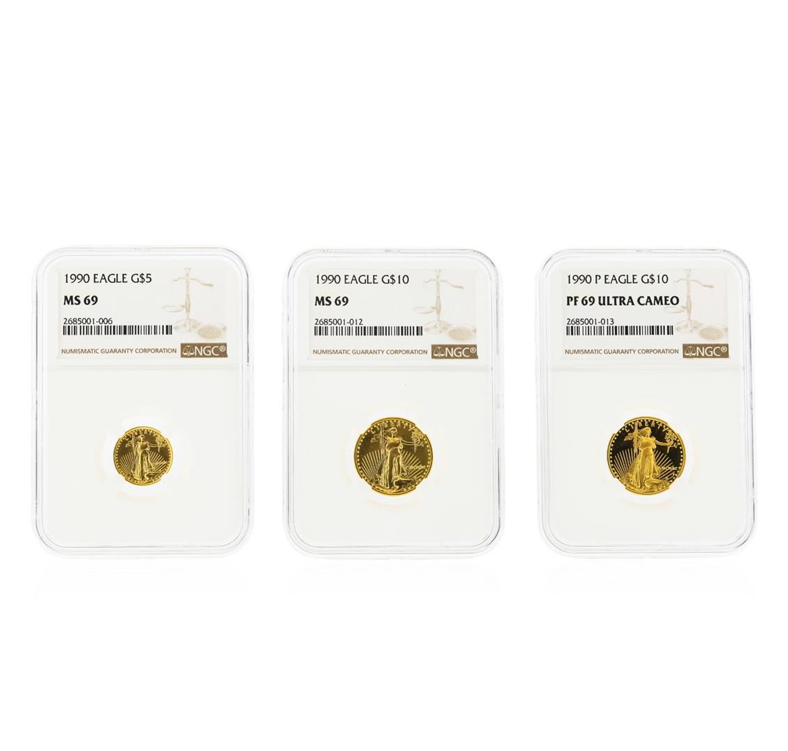 This set includes the following coins: 1990 $5 American Gold Eagle NGC Graded MS69, 1990 $10 American Gold Eagle NGC Graded MS69, and a 1990-P $10 American Gold Eagle NGC Graded PF69 Ultra Cameo Gold Coin. NGC Certified.