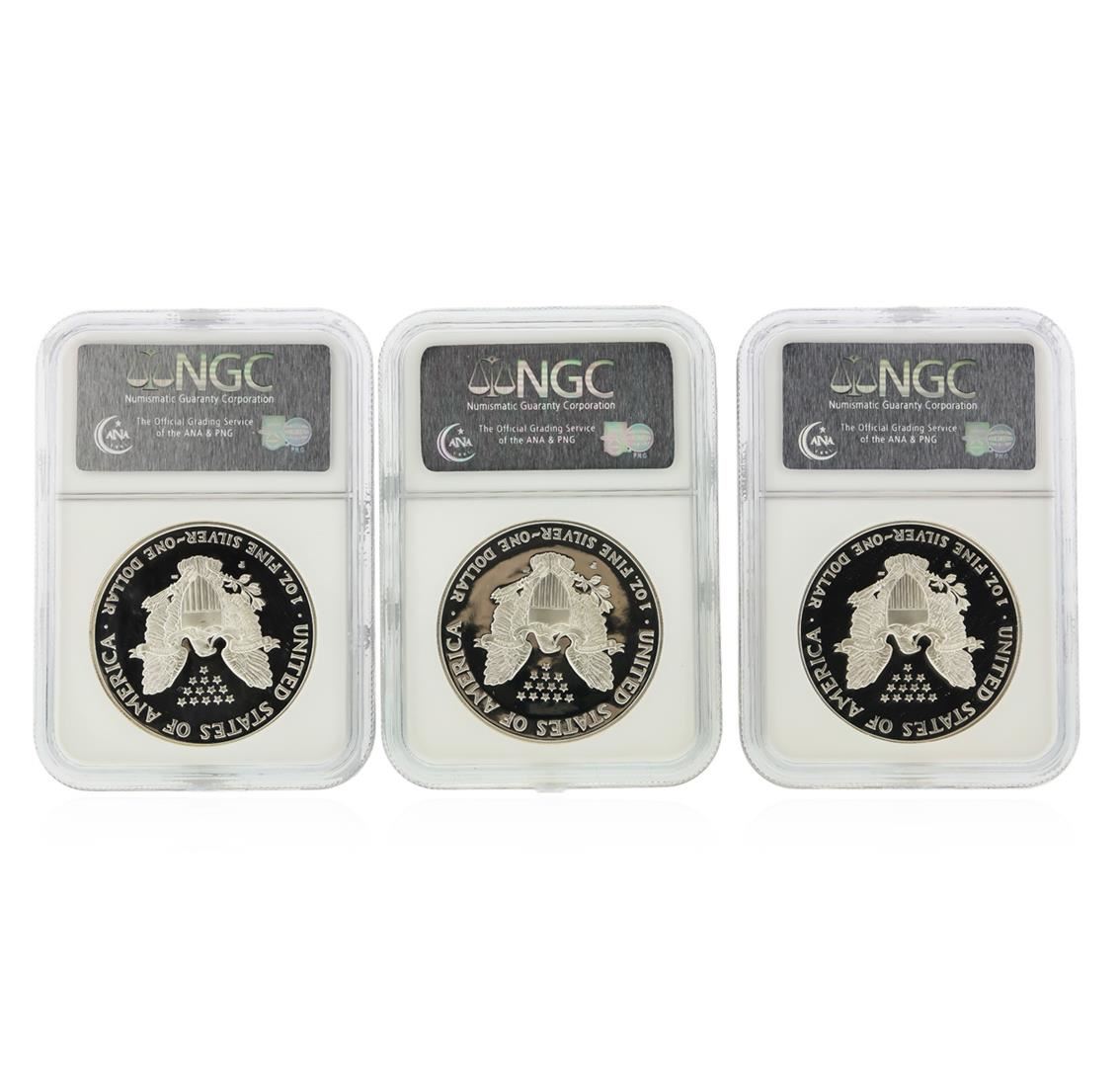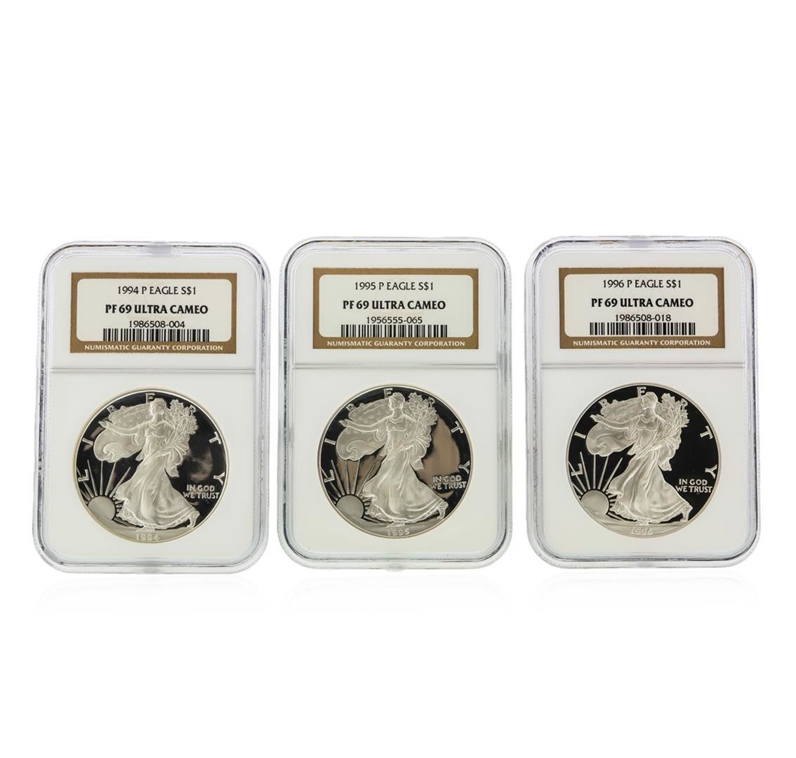 One Set of (3) 1994-1996-P $1 American Silver Eagle Coins NGC PF69 Ultra Cameo. NGC Certified.