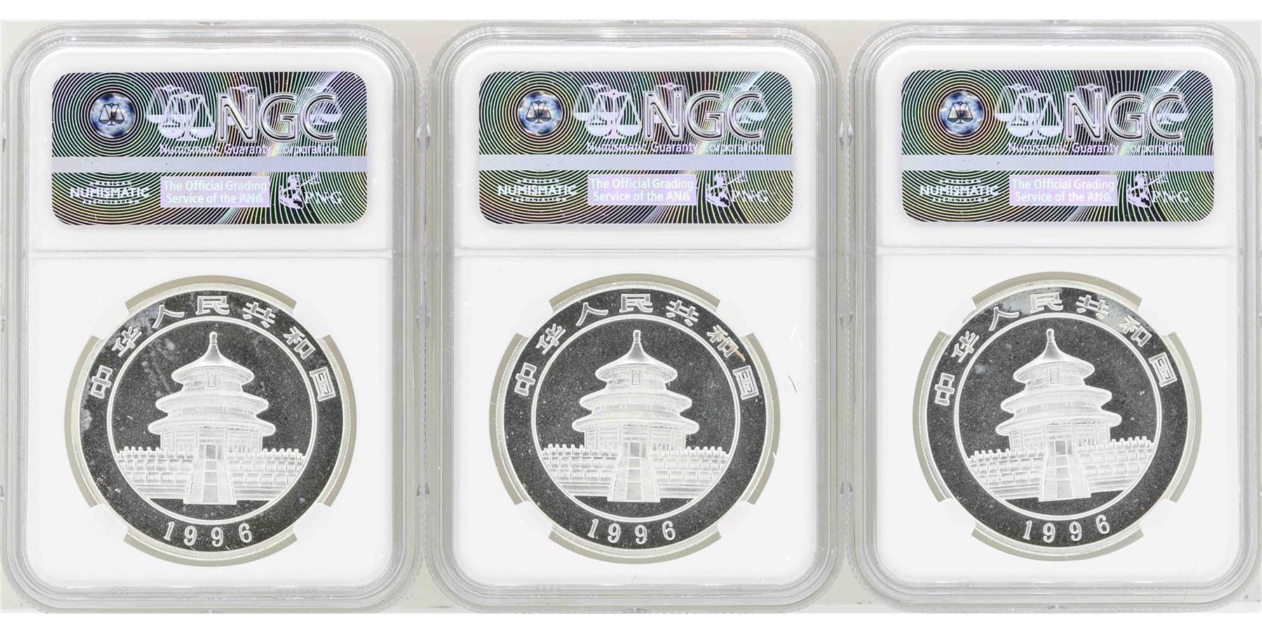One Set of (3) 1996 Large Date China 10 Yuan Silver Panda Coins NGC MS66/MS64. NGC Certified.