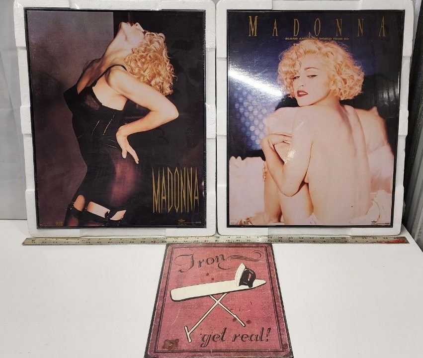 Set of 3, 2 Sealed Madonna Pictures, "Iron Get Real" sign