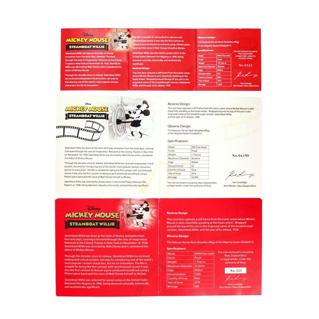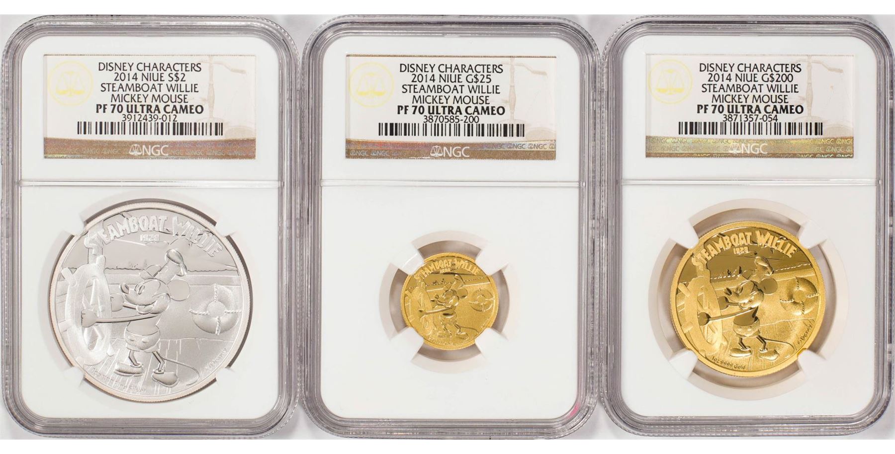 One Set of (3) 2014 Disney Steamboat Willie Mickey Mouse Coins NGC PF70 Ultra Cameo w/COA. NGC Certified.