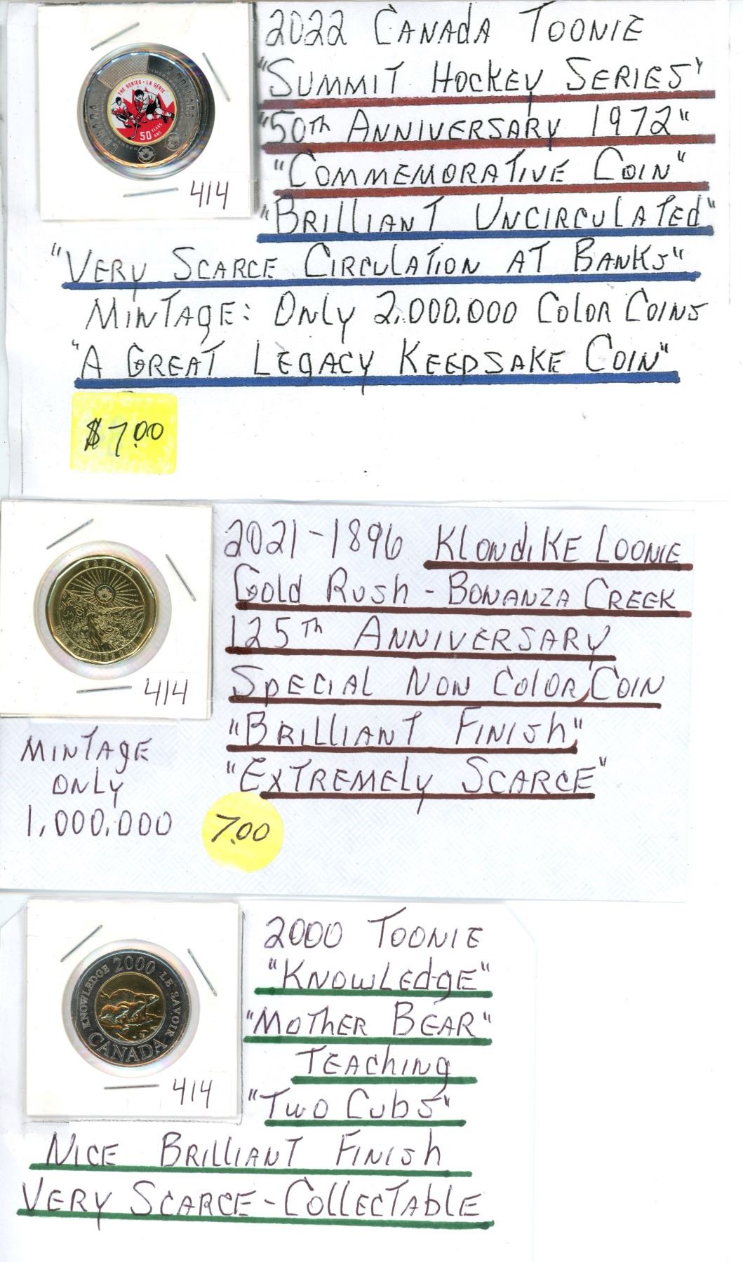 Set of 3, 2022 Summit Hockey series, colored Toonie and yr 2000 Mother bear Toonie & 1896-2021 Klondike Gold rush Loonie