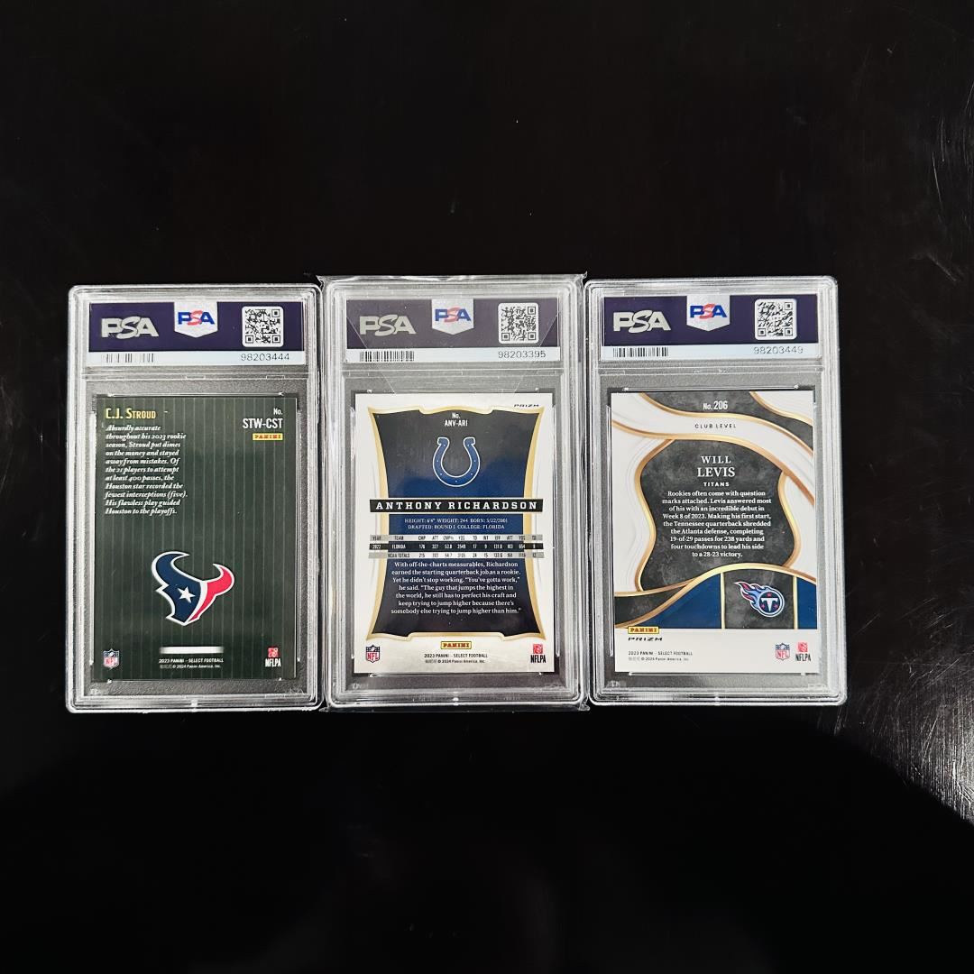 This trio of 2023 Select football rookie cards showcases top quarterback prospects: C.J. Stroud, Anthony Richardson, and Will Levis. Included are a Score Throwback #STW-CST of Stroud, an Anniversary insert #ANY-ARI of Richardson, and a Silver Prizm #206 of Levis--each graded PSA 8 (Near Mint-Mint). These eye-catching cards highlight standout rookies from the Texans, Colts, and Titans, capturing early moments from their promising NFL careers. A strong lot for investors and collectors focused on rising QB talent.