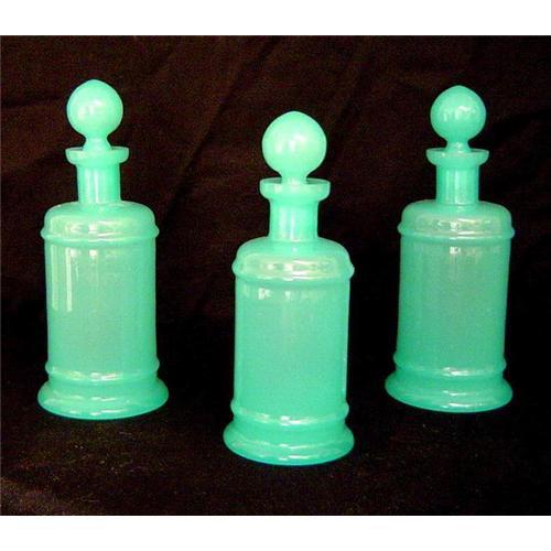 Set of (3) Antique French Opaline Glass Bottles With Stoppers. C. 1900 - 1915 Tall pair, with one slightly smaller bottle. Beautiful color. Excellent condition.