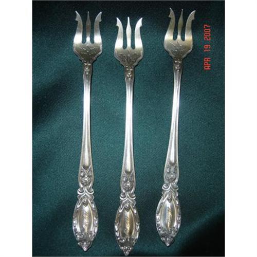 Set of 3 Baker-Manchester Sterling Oyster fork. The marking on the back is two birds with a M crest in the middle. They are the Lady Clare pattern and are circa 1914. They are in very good condition with almost no wear. They are monagrammed with the letters MDO.