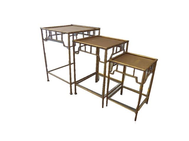 Gold Bamboo - Nesting tables - Set of 3pcs Dims: Large - 18"W x 18"D x 26"H Med: 15"W x 15"D x 23"H Small: 12"W x 12"D x 19"H Condition: used/scratches