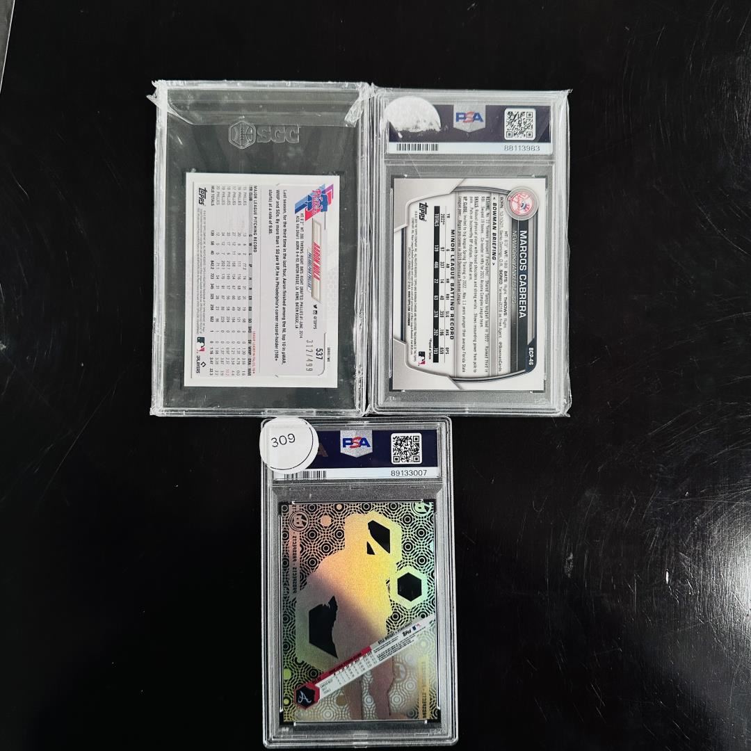This three-card lot includes standout players with graded, limited-edition cards. Features a 2021 Topps Aaron Nola Green Foil #/499 graded 10 by ISA, a 2023 Bowman Sapphire Chrome Marcos Cabrera Aqua Refractor #/125 graded PSA 10, and a 2018 Bowman High Tek Kyle Wright Gold Rainbow Autograph #/50 graded PSA 9. Each card is serial-numbered, with the Wright card showcasing an on-card signature. A solid mix of modern pitchers in top-tier condition.
