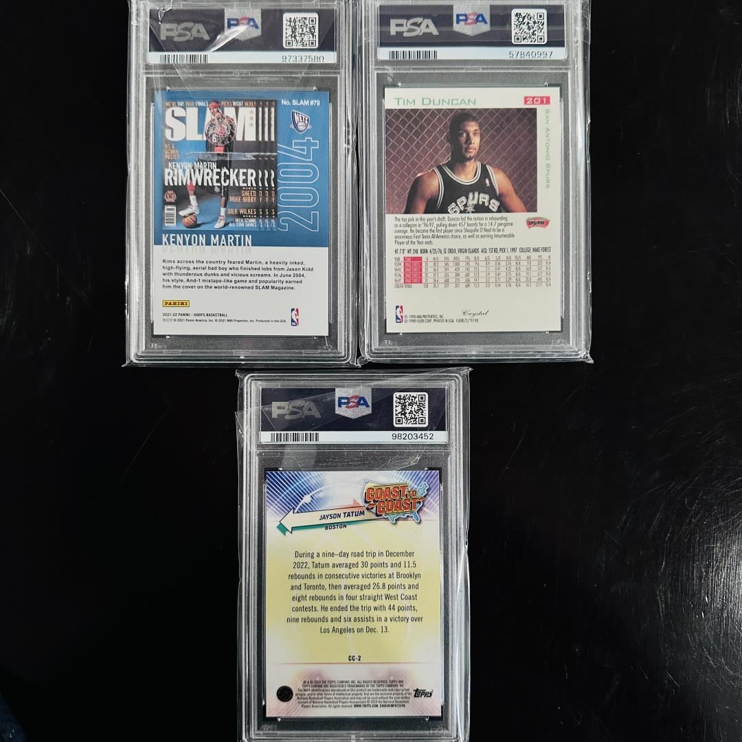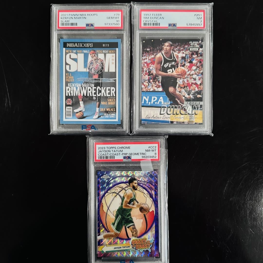 This trio includes three distinct PSA-graded basketball cards highlighting talent across generations. Featured is a 1997 Fleer #201 Tim Duncan Rookie card graded PSA 7, showcasing the legendary Spurs forward in his early NBA days. Also included is a 2023 Topps Chrome "Coast to Coast - PR Geometric" Jayson Tatum insert graded PSA 8, along with a 2021 Panini NBA Hoops SLAM #79 Kenyon Martin card in PSA 10 Gem Mint condition. A solid mix of modern and vintage stars in high-grade slabs for collectors of all eras.