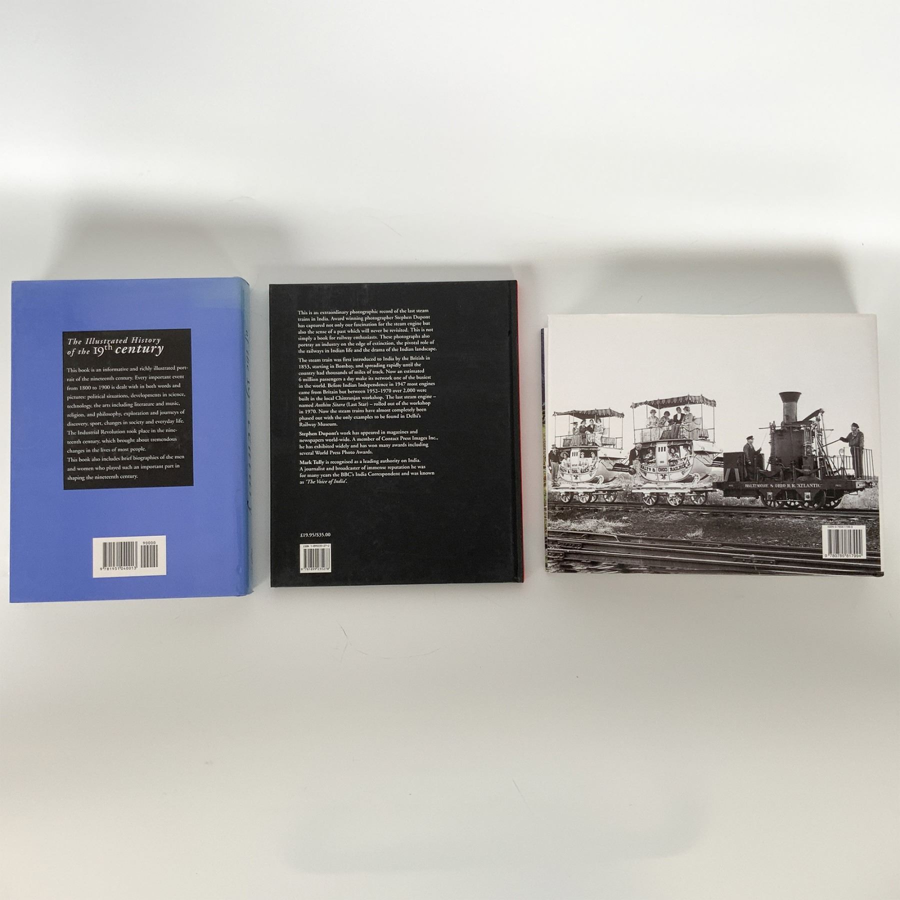 This lot features three hardcover books covering steam train history and 19th-century events. Included are The Illustrated History of the 19th Century, a visually rich exploration of significant historical events and advancements of the 1800s; Steam: India's Last Steam Trains by Stephen Dupont, an evocative photographic journey documenting the final era of steam locomotives in India, published by Dewi Lewis; and The History of North American Steam by Christopher Chant, which chronicles the development and legacy of steam trains across the continent. This collection is ideal for history enthusiasts and railway aficionados.