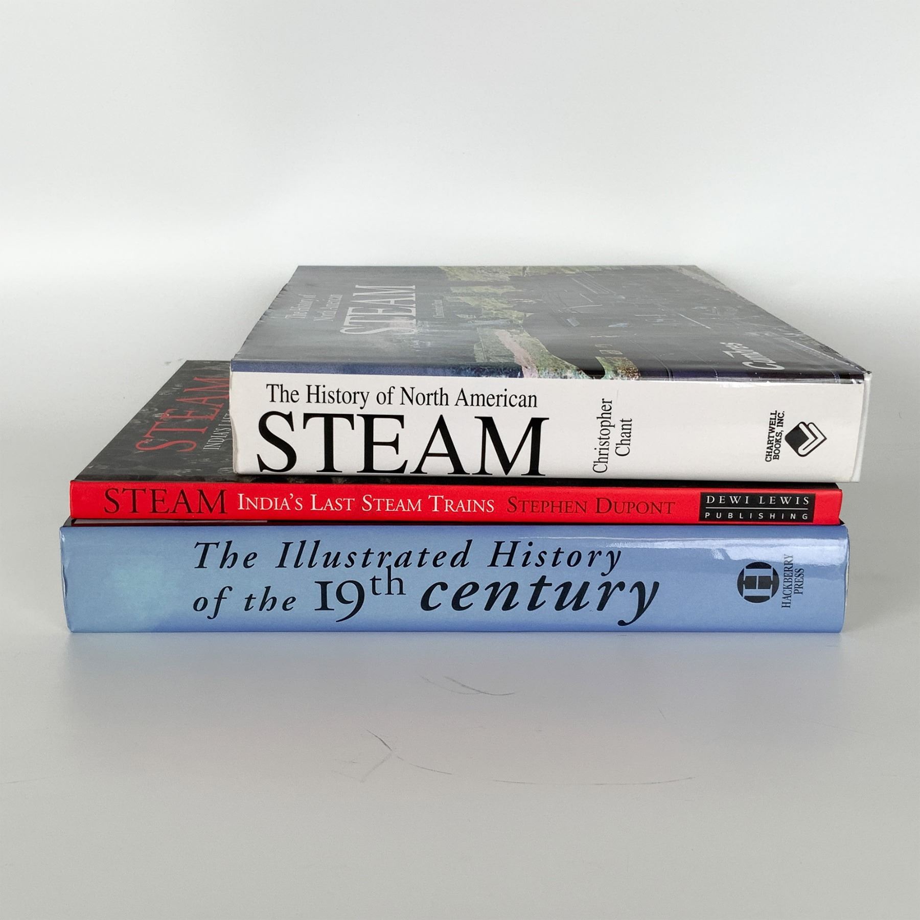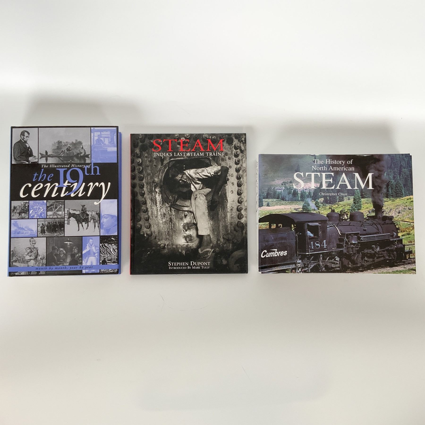 This lot features three hardcover books covering steam train history and 19th-century events. Included are The Illustrated History of the 19th Century, a visually rich exploration of significant historical events and advancements of the 1800s; Steam: India's Last Steam Trains by Stephen Dupont, an evocative photographic journey documenting the final era of steam locomotives in India, published by Dewi Lewis; and The History of North American Steam by Christopher Chant, which chronicles the development and legacy of steam trains across the continent. This collection is ideal for history enthusiasts and railway aficionados.