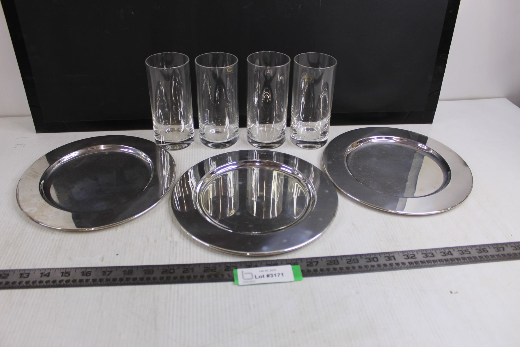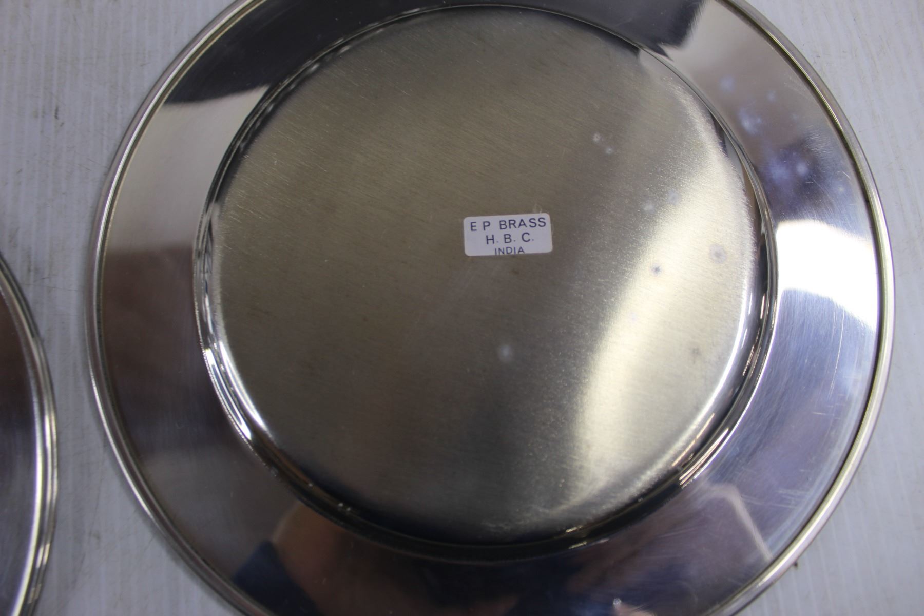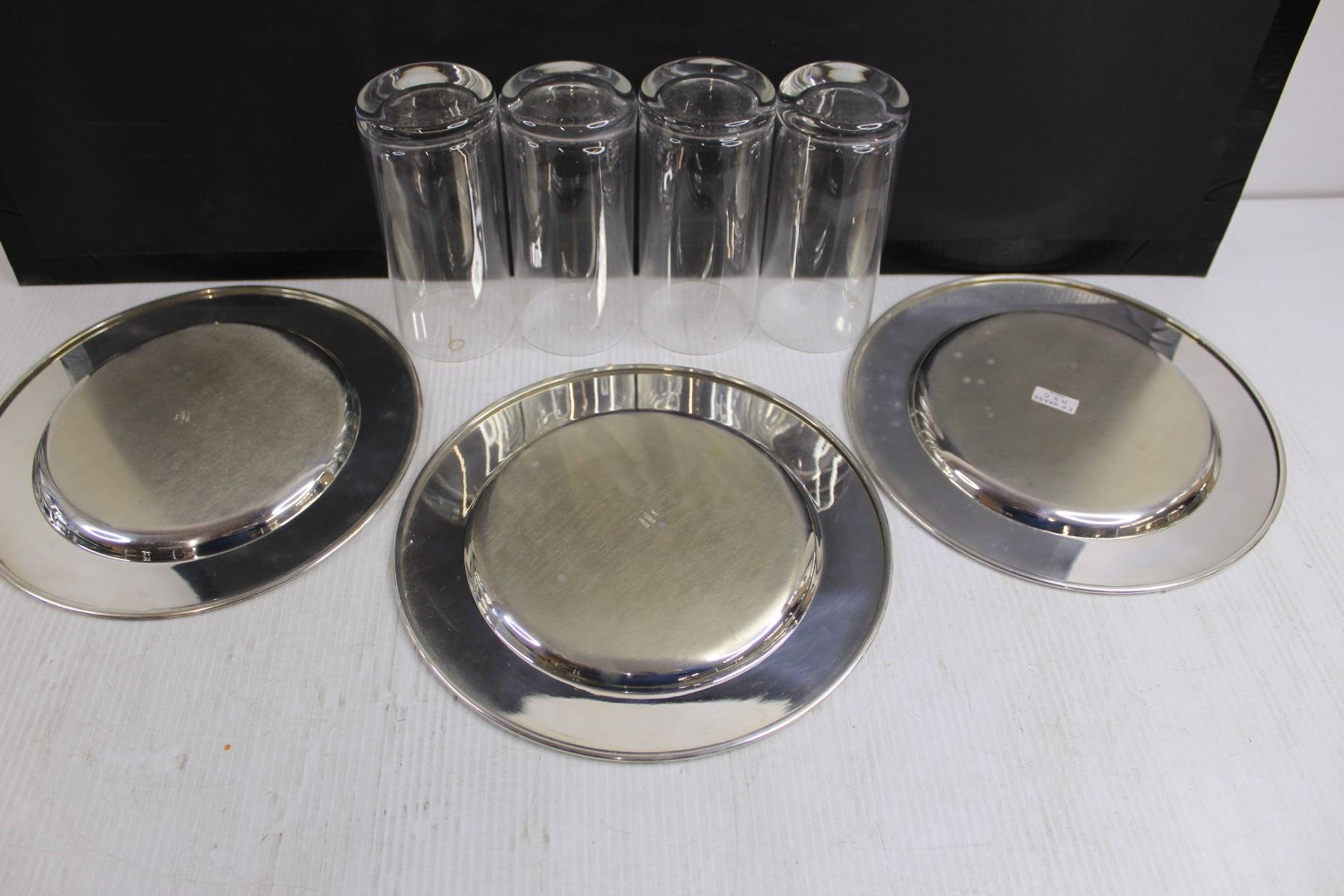 Set of 3 Brass Plates 10" Dia, Set of 4 Glass Vases 6" Tall