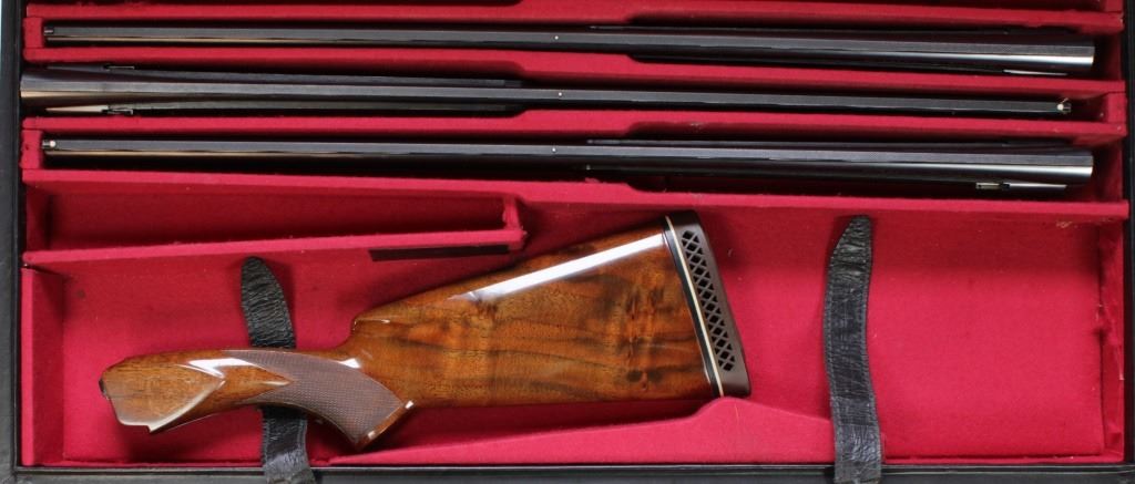 Set of 3 Browning Superposed O/U 28" steel barrels and walnut stock including .410, .28 and 20 gauge all choked skeet with matching serial number 28873 S74. Barrels show very good condition with some light handling and use marks. Checkered deluxe walnutand walnut stock including .410, .28 and 20 gauge all choked skeet with matching serial number 28873 S74. Barrels show very good condition with some light handling and use marks. Checkered deluxe walnut stock also very good, lower engraved tangscrews intact, original high gloss finish and Browning buttpad. From old St. Louis collection. Est. 500-1000