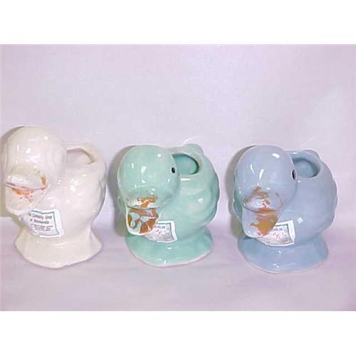 Set of 3 Brush-McCoy 1911 4" Ducklings. Blue, cream and green. Colors are timeless ones! Paint and glaze are crazed and some paint just gone. They show their age, as they should! Thankfully, no one painted them! From our childhood. (Or before, depending on your age!)