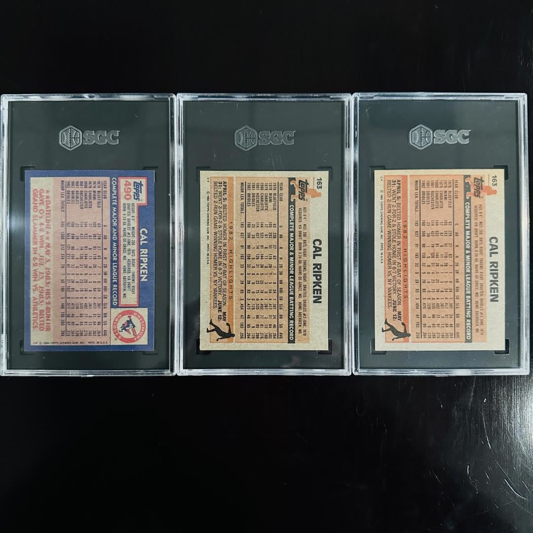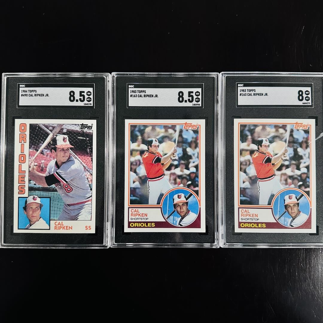 This lot includes three classic Cal Ripken Jr. cards, each professionally graded by SGC. Featured are two 1983 Topps #163 cards--one graded 8.5 NM-MT+ and the other an 8 NM-MT--both showcasing Ripken in his early prime with the Orioles. Also included is a sharp 1984 Topps #490 card, also graded 8.5 NM-MT+, capturing the Hall of Famer with a bold in-action pose and his signature side portrait layout. A solid addition for collectors of 1980s baseball legends.