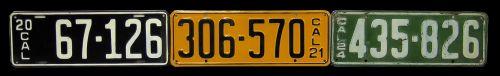 Set of 3 California License Plates 1920, 1921 near mint 1924 very good condition.