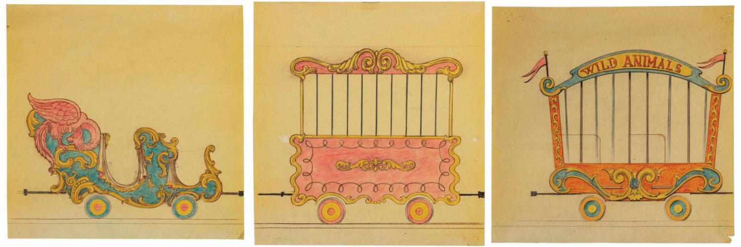 (Disneyland, 1955) A set of (3) hand-colored brownline prints of train car concept designs by Imagineer Bruce Bushman for the Casey Jr. Circus Train attraction at Disneyland. Accomplished in crayon on brownline prints, the designs include a pair of wild animal cage cars and a passenger car decorated with a griffin relief figure and elaborate filigree-style embellishment. Inspired by the train in the film Dumbo, the Casey Jr. Circus Train miniature railroad ride was an opening day attraction at the park. The concept artworks range in size from 12.5"x11.75" to 12.25"x12.5" and are in good condition with moderate corner pinholes from production use, minor corner loss, and corner creasing.