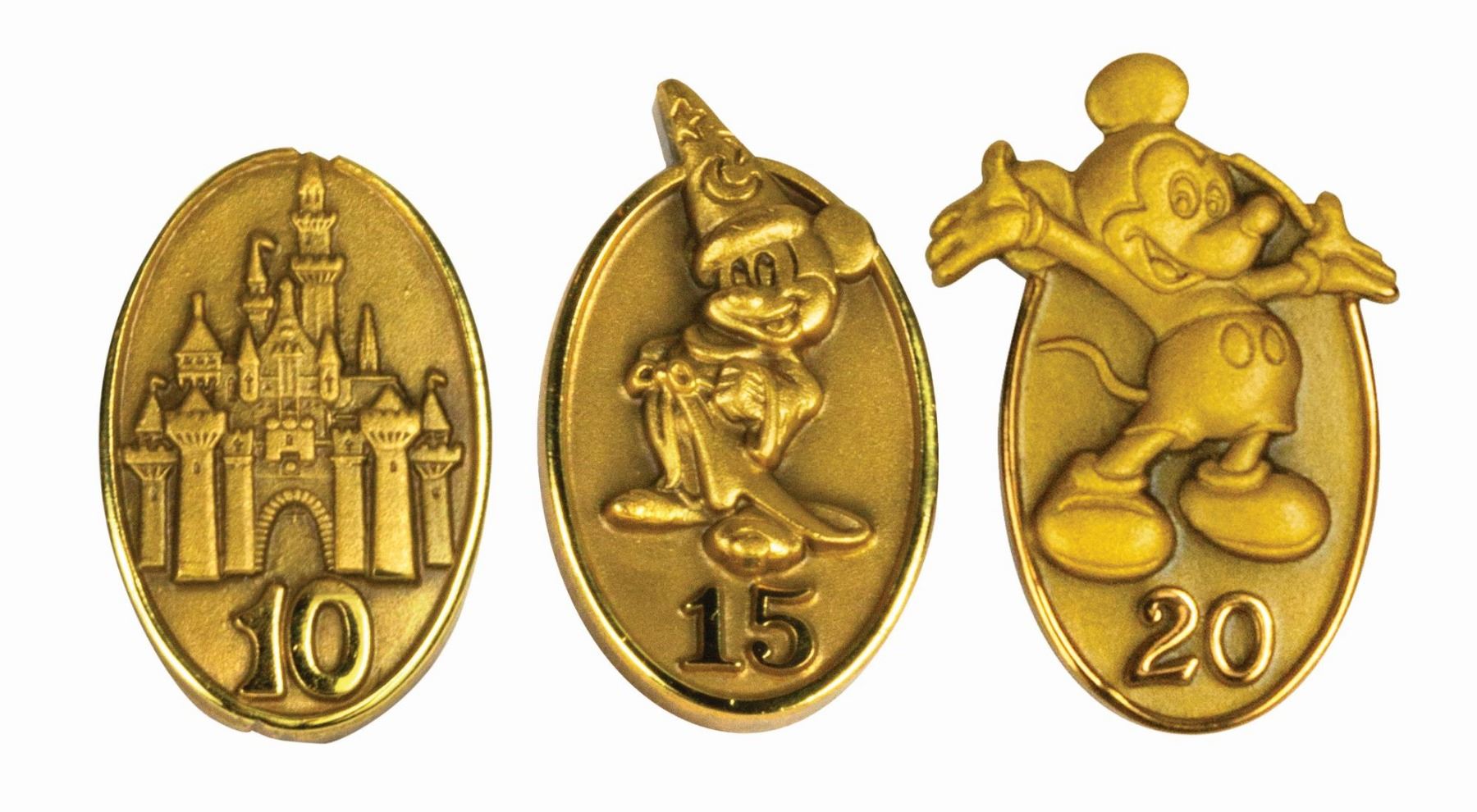 (Disneyland, c.1990s) A set of (3) pins awarded to a Disneyland cast member to mark significant employment anniversaries for their 10th, 15th, and 20th years at the park. The pins depict Sleeping Beauty Castle, Sorcerer Mickey, and open arms Mickey. The pins measure approximately 0.75"x0.5" each with some variance in size. The condition is very good with light wear.