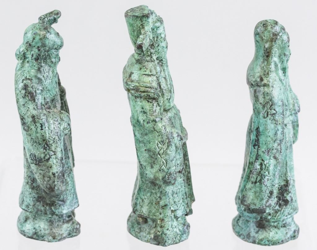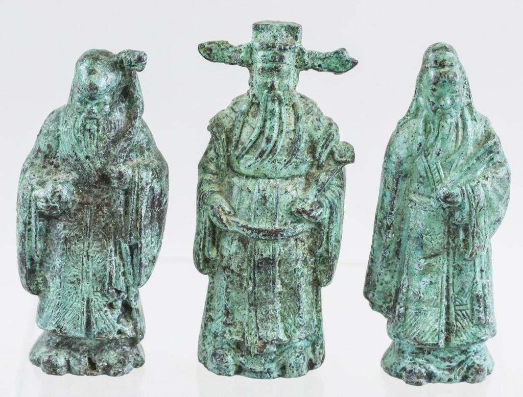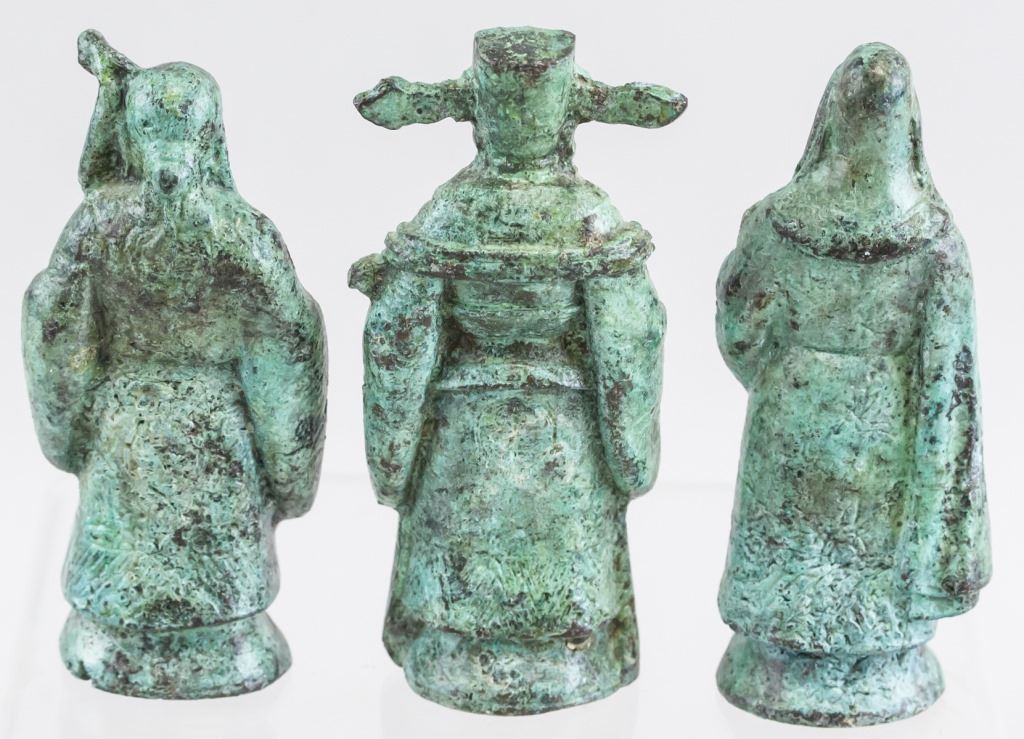 Chinese bronze statues. Featuring Fu (Fortune), Lu (Wealth), and Shou (Longevity). 6 x 4 cm. 771 grams.