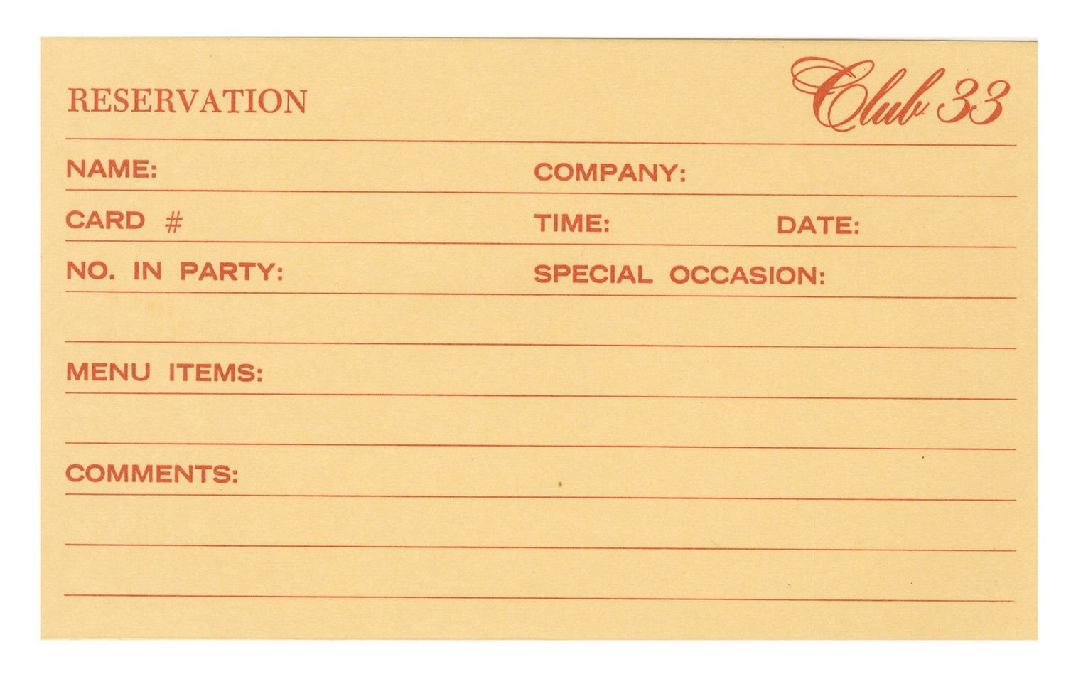 (Disneyland, c.1967) A pair of reservation cards and a guest record card from Disneyland's exclusive Club 33. One of the club's hallmarks is the VIP treatment they provide for guests, and these cards are a testament to the information the club would collect to ensure this level of service. The reservation cards measure 3"x5" and the guest record card is 5"x8". The cards are all in very good condition with minor edge wear.