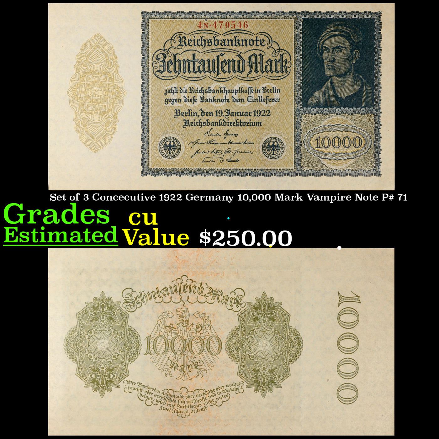 Set of 3 Concecutive 1922 Germany 10,000 Mark Vampire Note P# 71 Grades CU. Among the many bills issued during the hyperinflation crisis in the post-WWI German Weimar Republic, the "Vampire Note" is a particular standout. It is known as the Vampire Note because when the note's engraver (identity unknown) adapted a portrait by famous German Renaissance painter Albrecht Durer for the note, he made an odd alteration where the neck of the figure looks like a Vampire when the bill is rotated 90 degrees. It takes some imagination to see, but was intentional and meant to represent the anti-French sentiment in WWI Germany -- France was considered to be "sucking the life out of" the country following the signing of the Treaty of Versailles. The Reichsbank noticed this alteration, but did not change it, printing several varieties of the bill with the design and giving credence to the popular anti-French sentiment. There are three varieties, Pick # 70 and 71 differing in the reverse design, and Pick # 72 being a smaller version of Pick # 71.