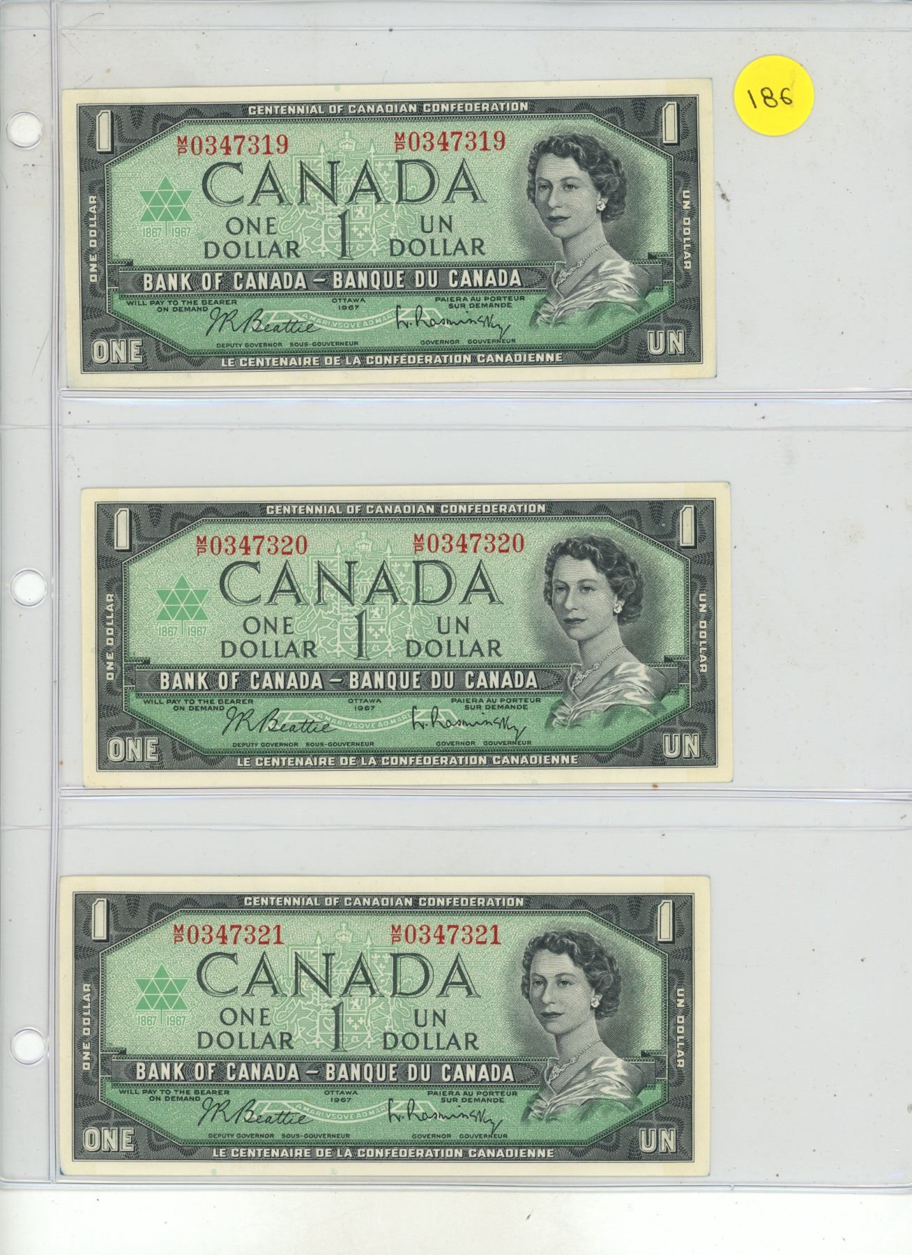 Set of 3 Consecutive Serial Number 1967 $1 notes. M/P Prefix. Serial Numbers 034319, 034320 & 0347321.