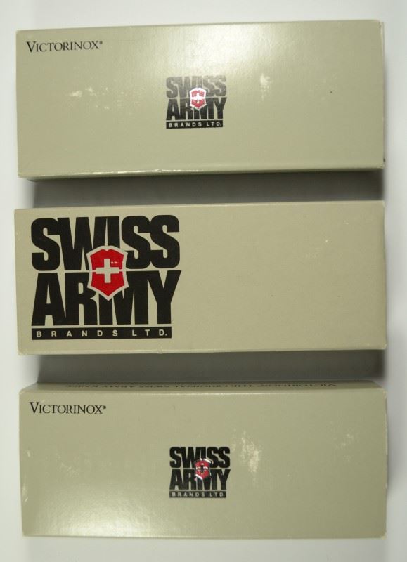 Set of 3 Different Victorinox Swiss Army Knives. All come with boxes. Various tools on each. EST:$100-$120