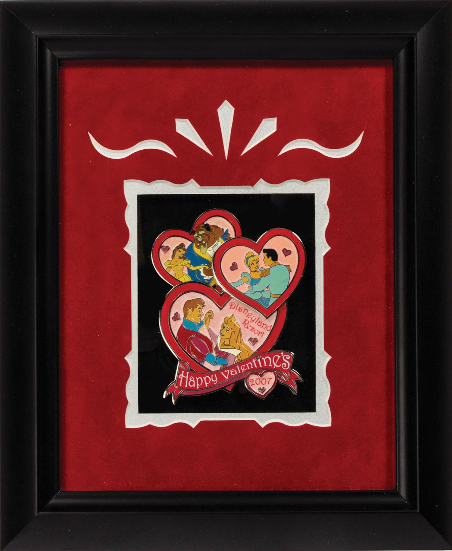 (Disneyland, 2007) A set of (3) limited edition Happy Valentine's pins from Disneyland. These pins feature Belle, Cinderella, and Aurora dancing with their respective princes and are limited edition of 500. These pins are displayed in a frame which measures 12.5"x10.25". The set is in fine condition with minor wear to the frame.