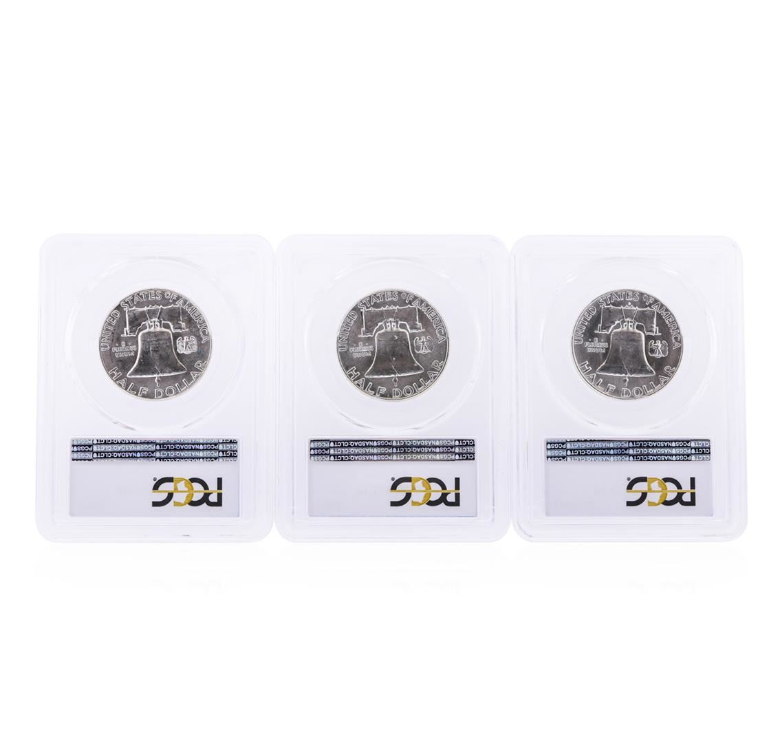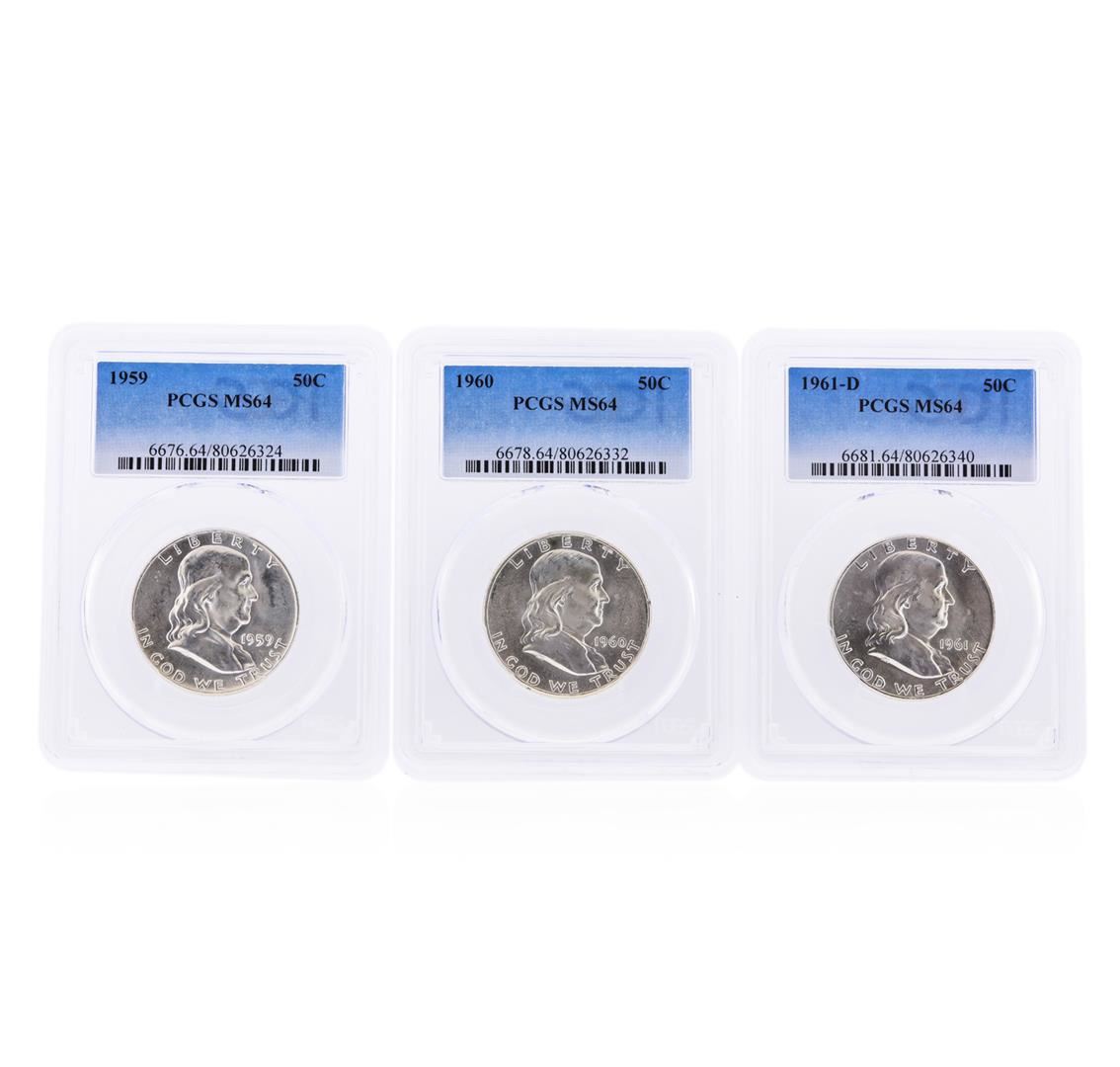 Set of (3) 1959-61 Franklin Half Dollar PCGS Graded Coins which includes the following (3) coins: (1) 1959 Franklin Half Dollar PCGS Graded MS64, (1) 1960 Franklin Half Dollar PCGS Graded MS64, and (1) 1961-D Franklin Half Dollar PCGS Graded MS64. PCGS Graded.