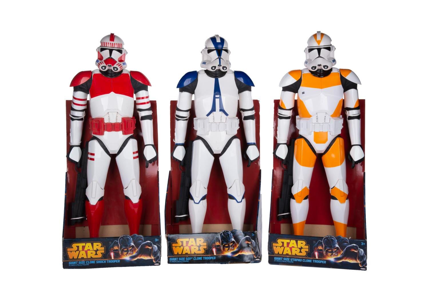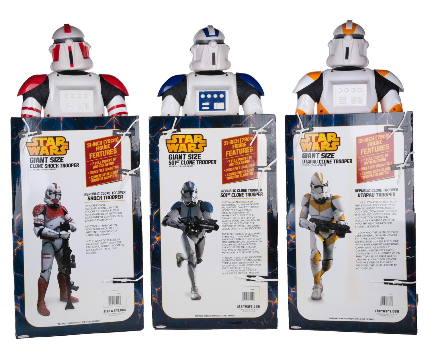 (Jakks-Pacific/Lucasfilm, 2013) A collection of (3) Giant Size 31" Clone Trooper action figures by Jakks-Pacific. Included are a Blue 501st trooper, a Red Shock Trooper, and a Yellow Utapau Trooper. All three are still attached to their original open front package. The yellow and red figures are in very fine condition, still in their original shipping boxes. The blue 501st Trooper is very good with slight wear to the front, and curving and edge wear to the front panel of its package.
