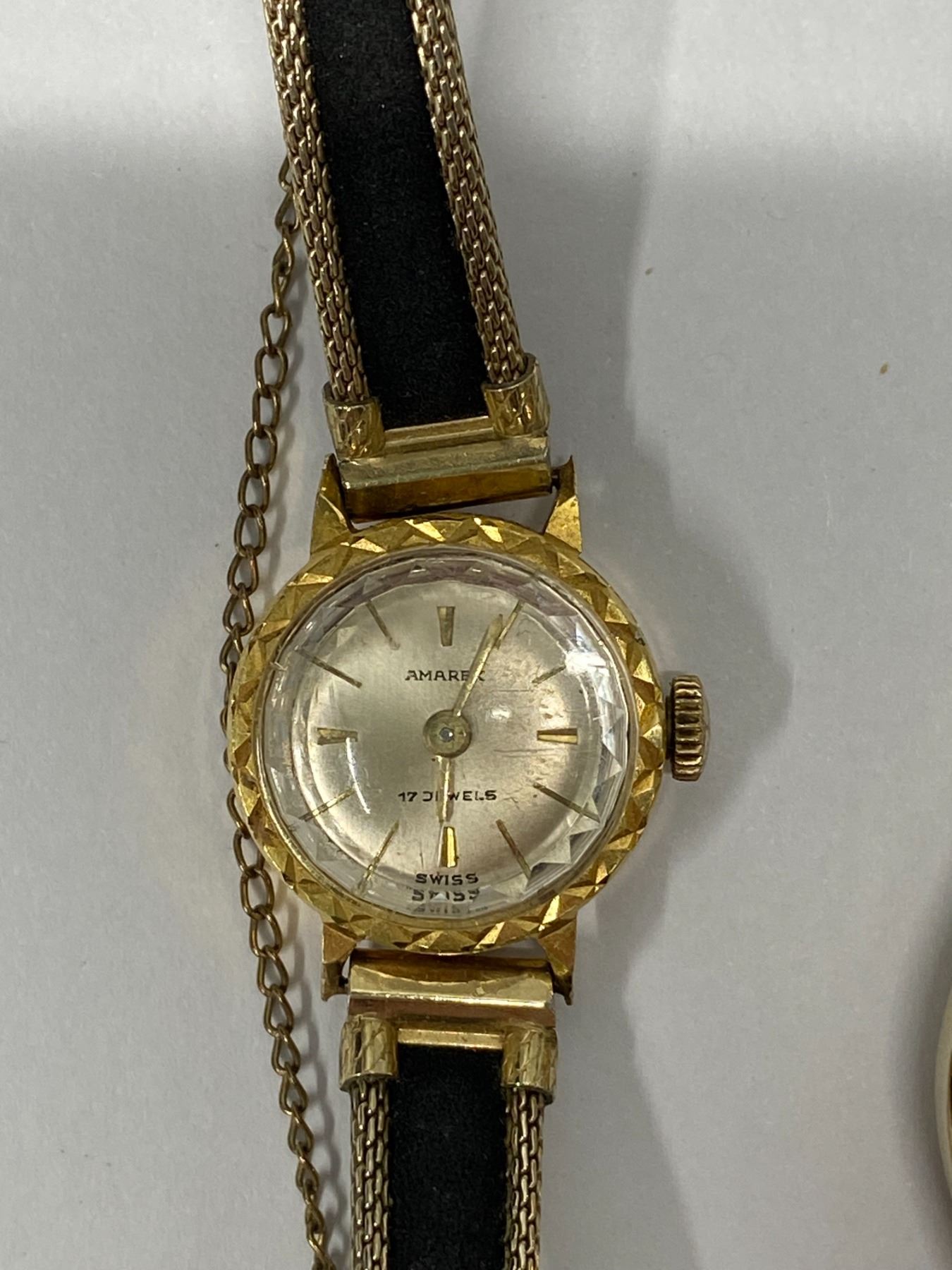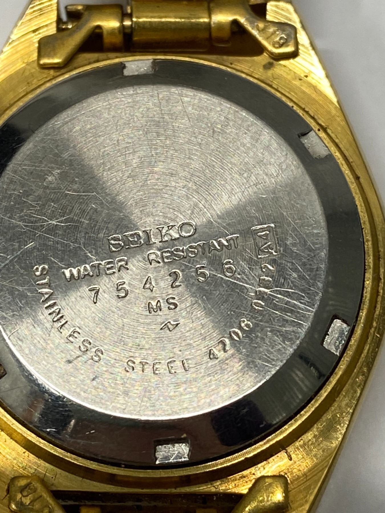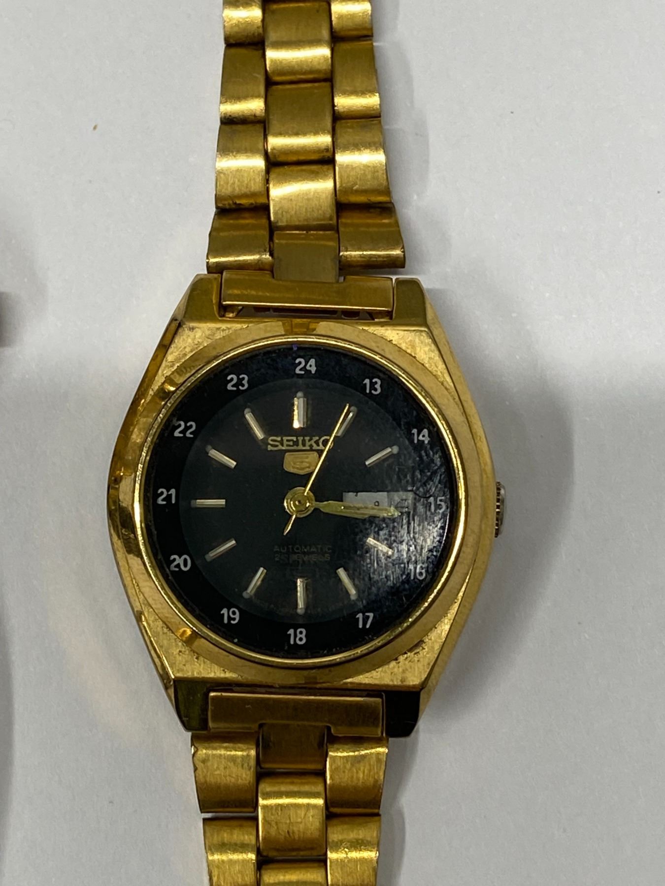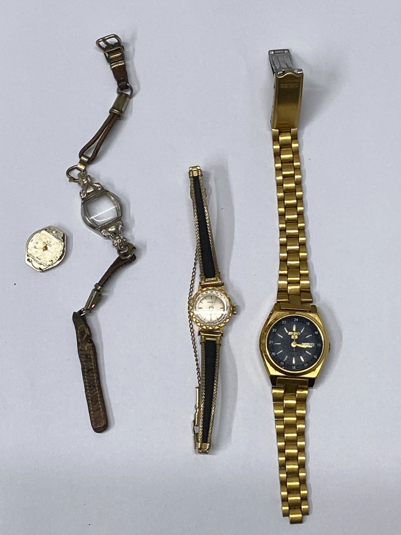 Seiko watch working but strap is broken; 1 vintage watch for parts only; Amarex vintage watch seems ok but untested -18k gold inside mechanism (time handles) only.