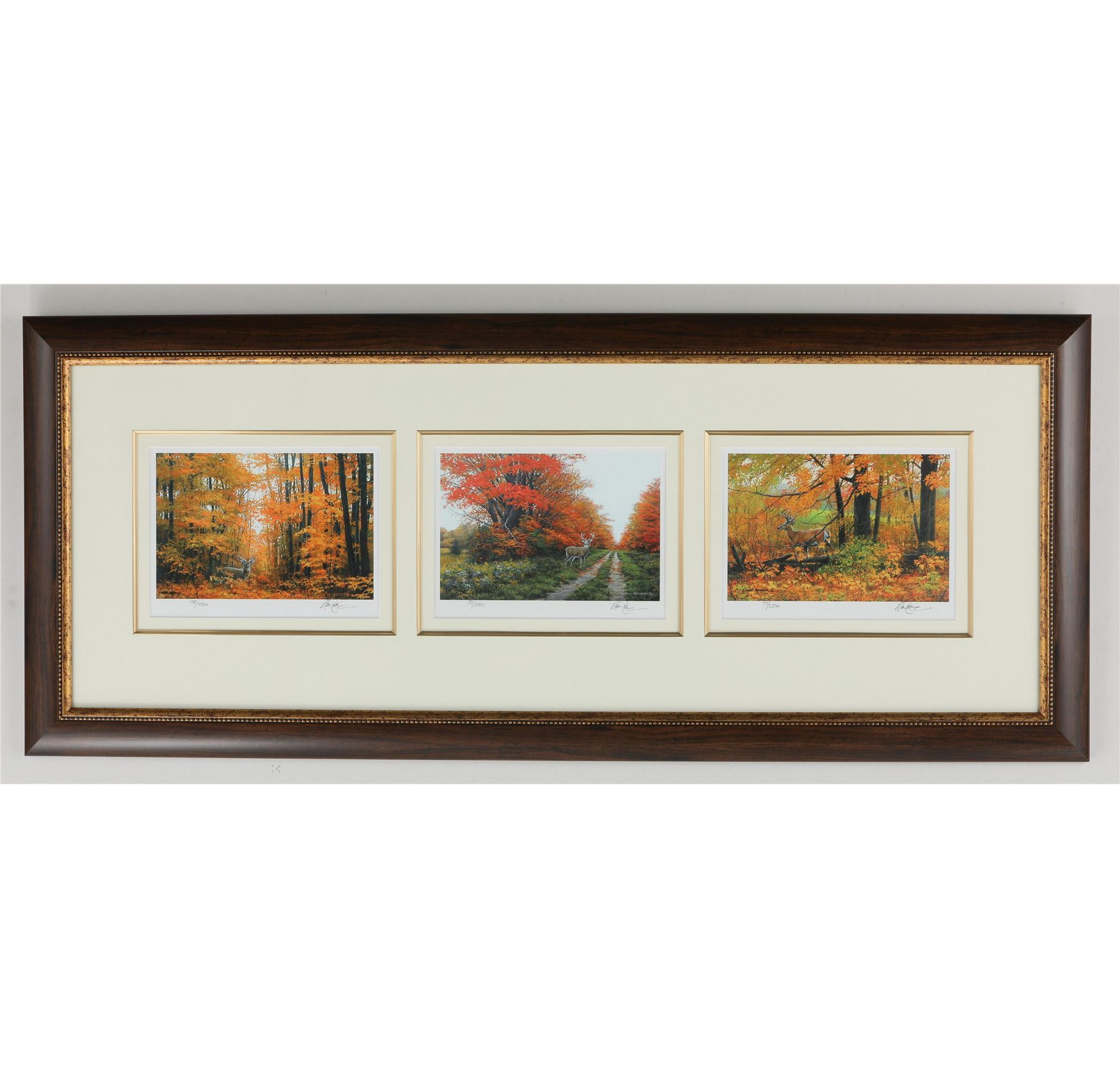 set of 3 limited edition prints, signed and numbered 108/2500, 33/2500, and 77/2500. This piece has been professionally matted, and custom framed under glass. Image- 6" x 9" (each). Frame- 18" x 44".
