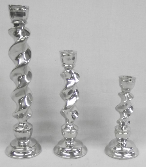 Set of 3 Metal Candlestick Holders. Decorate your table with these nicely weighted marvelous twisted design candlesticks. The tallest measures approx. 12''H x 4.25''W.
