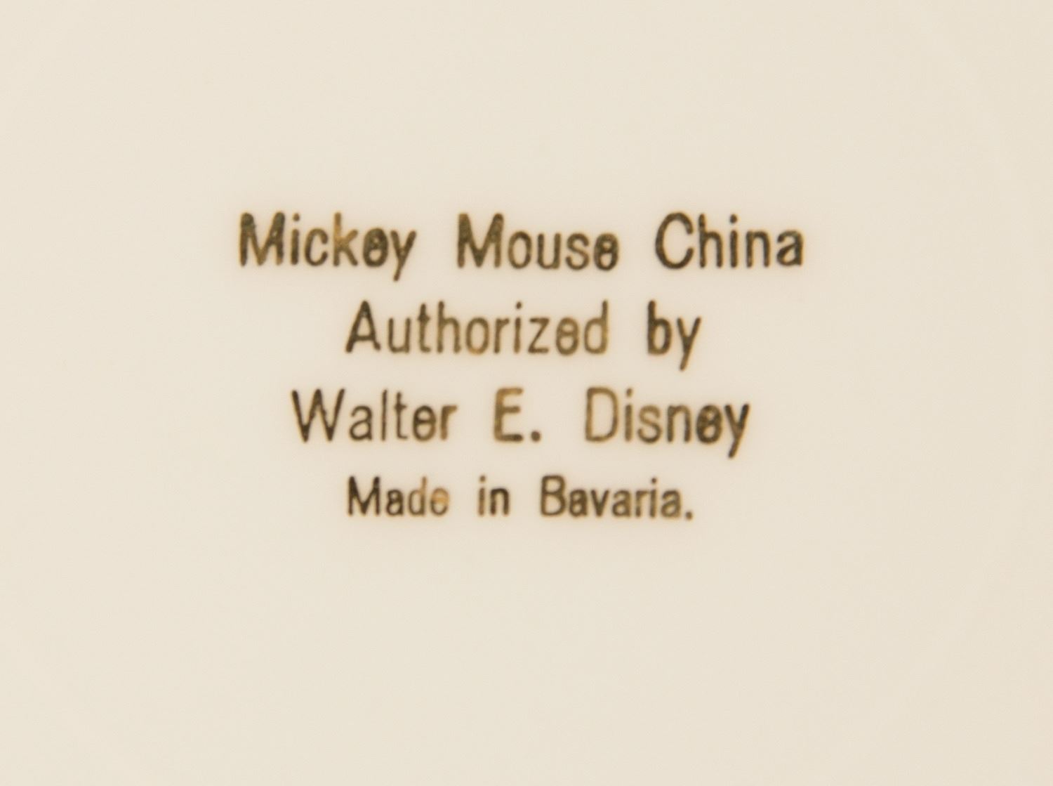 (Disney, 1932) A set of (3) rare early Mickey Mouse plates from a series of fine china produced in the Bavaria region of Germany. The plates feature such characters as Mickey, Minnie, and the black cat from the Opry House short. All are marked on the reverse, two with a Mickey Mouse graphic and “Trademark Authorized by Walter E. Disney Bavaria,” and one with the text, “Mickey Mouse China Trademark Authorized by Walter E. Disney Made in Bavaria.” Measuring 7.5” in diameter, the plates are in very good condition. They exhibit some minor wear to the gold luster rings around the outer edges and a few small instances of spot rubbing to graphics.