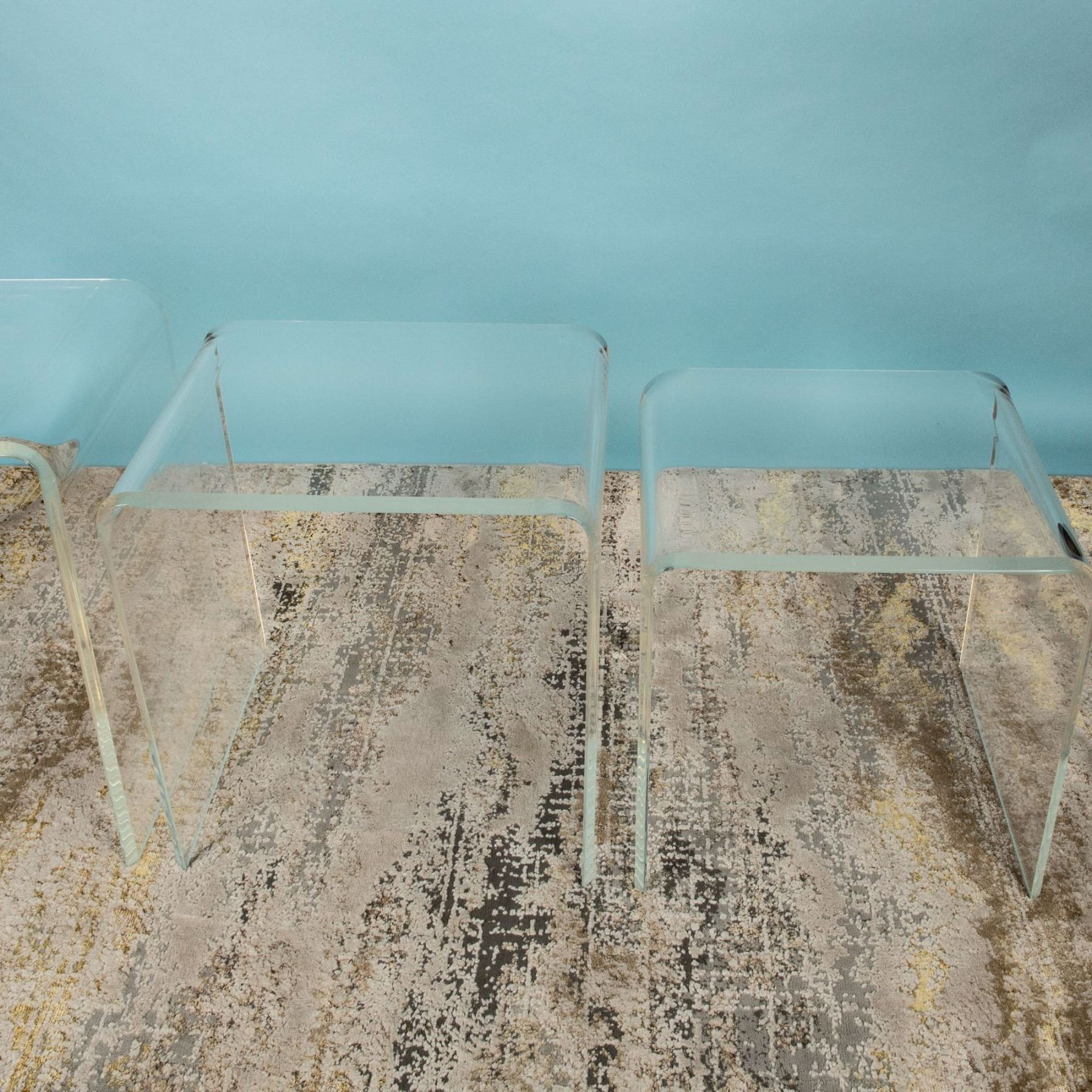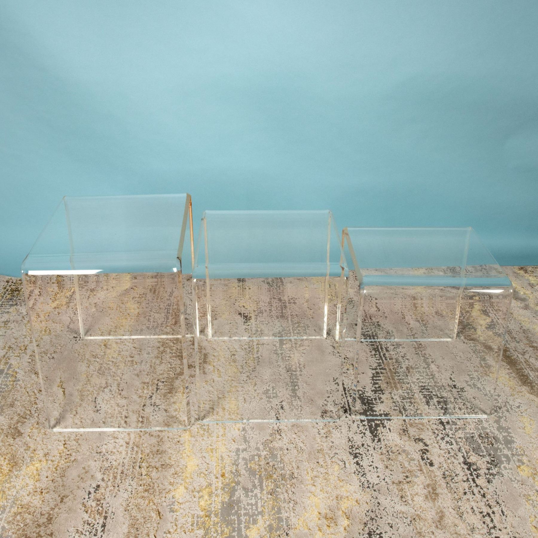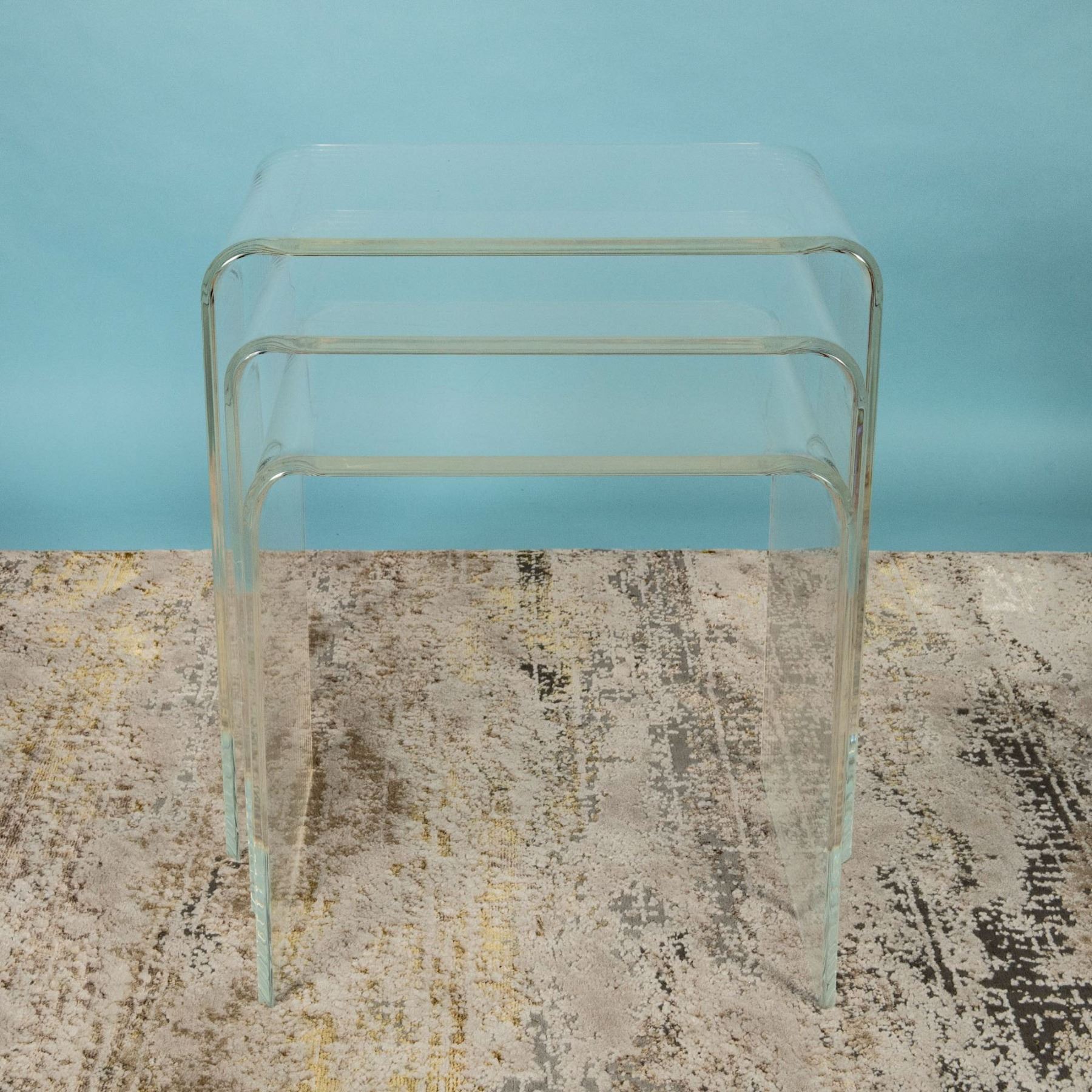 A stunning set of three Mid-Century Modern clear Lucite nesting tables, showcasing the era's fascination with innovative materials and minimalist design principles. These nesting tables are both functional and aesthetically striking, offering a versatile solution for space-saving furniture. The sleek, clear Lucite construction gives them a weightless appearance, allowing them to blend seamlessly into a variety of interior styles, from contemporary to retro-modern and Hollywood Regency. Nesting tables like these became popular in the 1960s and 1970s, reflecting the growing demand for multifunctional and space-saving furniture. While the designer of this set is unconfirmed, the style is reminiscent of pieces by iconic mid-century designers like Charles Hollis Jones, who is credited with popularizing Lucite furniture. This material was a hallmark of modern design, celebrated for its strength, versatility, and ability to create visually striking pieces without dominating a room. Dimensions (Largest Table): Length: 21 inches Width: 16 inches Height: 21.25 inches