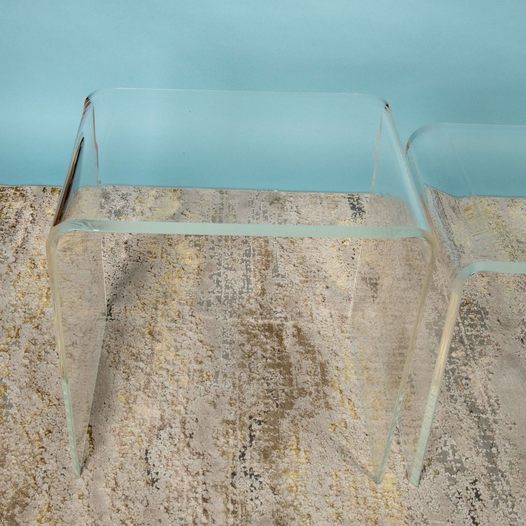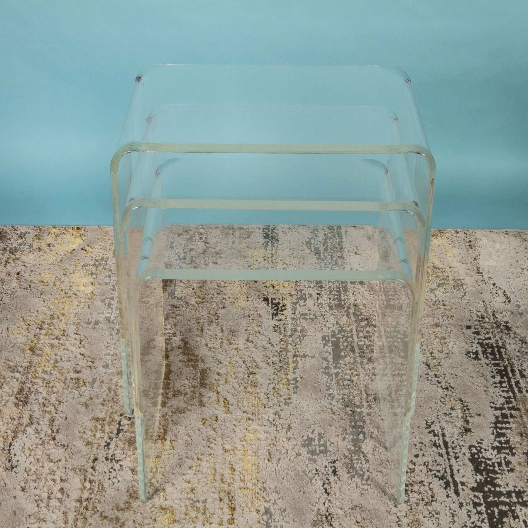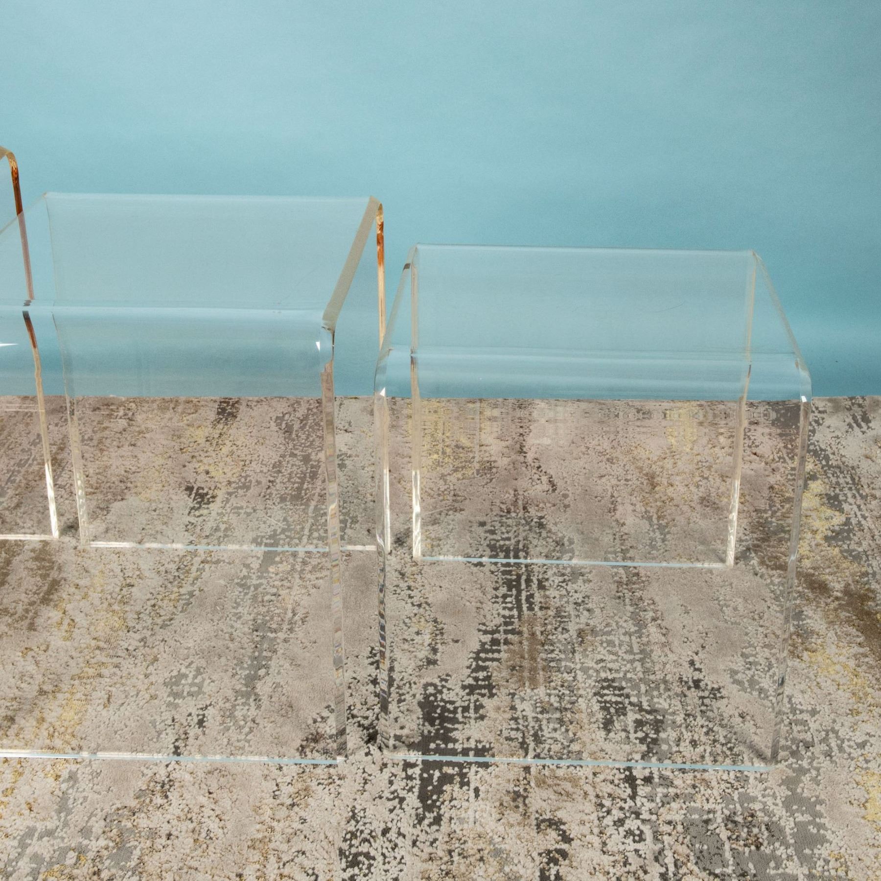 A stunning set of three Mid-Century Modern clear Lucite nesting tables, showcasing the era's fascination with innovative materials and minimalist design principles. These nesting tables are both functional and aesthetically striking, offering a versatile solution for space-saving furniture. The sleek, clear Lucite construction gives them a weightless appearance, allowing them to blend seamlessly into a variety of interior styles, from contemporary to retro-modern and Hollywood Regency. Nesting tables like these became popular in the 1960s and 1970s, reflecting the growing demand for multifunctional and space-saving furniture. While the designer of this set is unconfirmed, the style is reminiscent of pieces by iconic mid-century designers like Charles Hollis Jones, who is credited with popularizing Lucite furniture. This material was a hallmark of modern design, celebrated for its strength, versatility, and ability to create visually striking pieces without dominating a room. Dimensions (Largest Table): Length: 21 inches Width: 16 inches Height: 21.25 inches