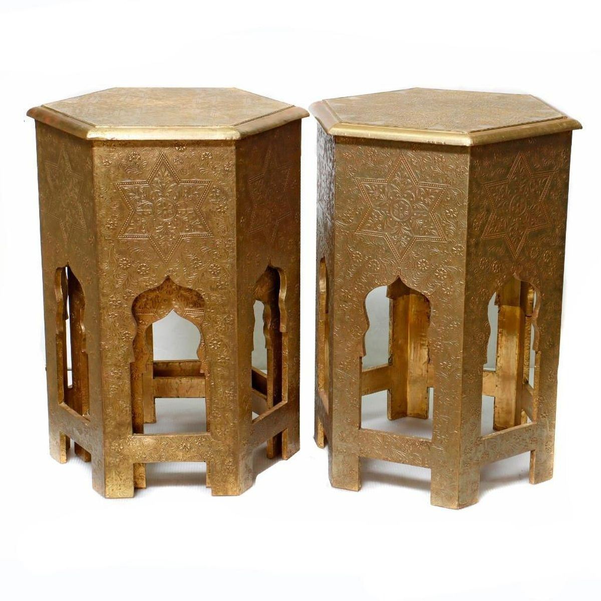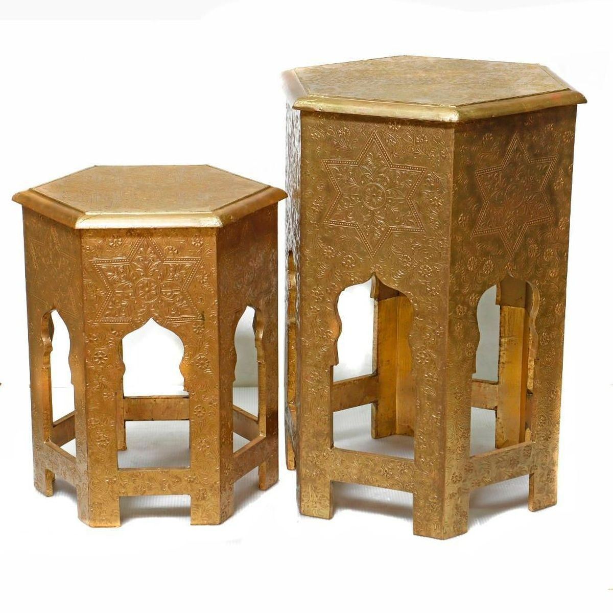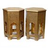 The gold finish metal-covered table group consists of two measuring 16in. x 16in. x 24 1/4in., and one smaller 18 1/2in. x 18 1/2in. x 13 3/4in. All in good condition.