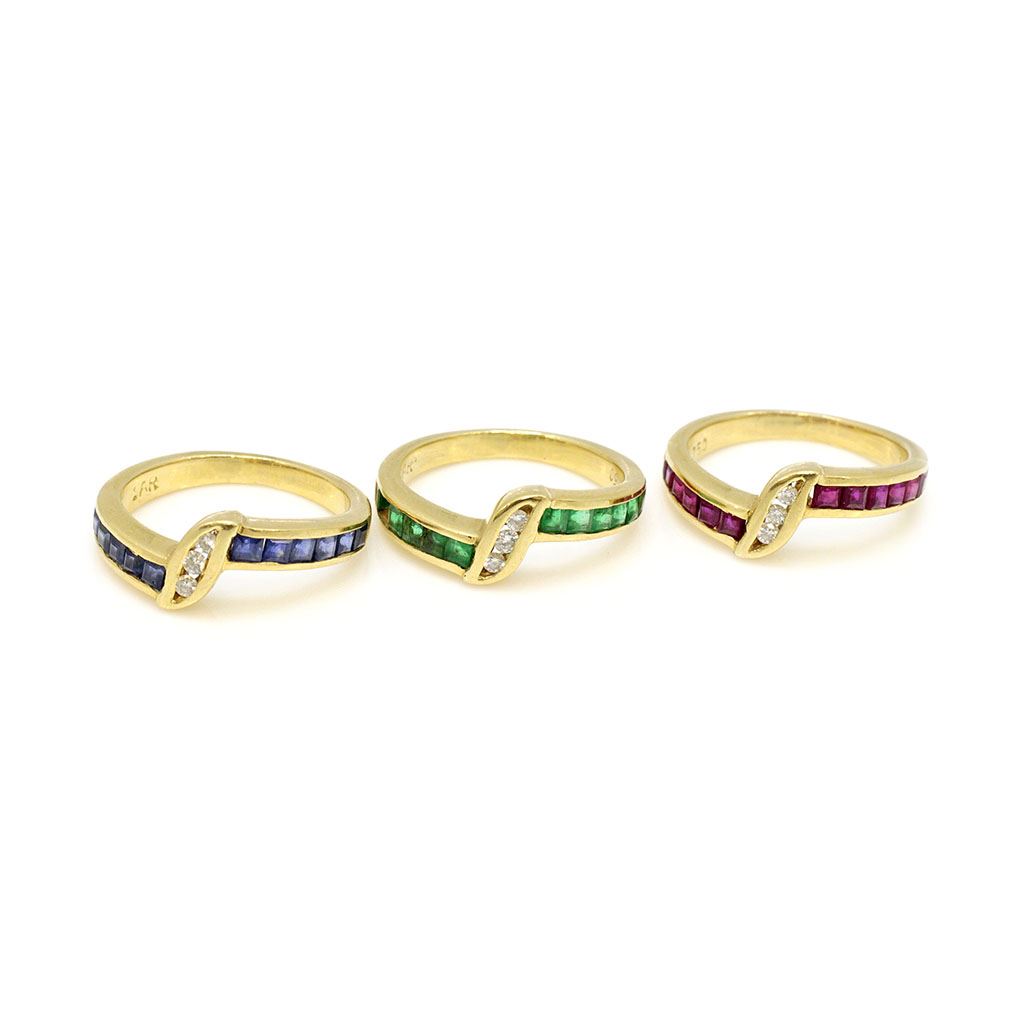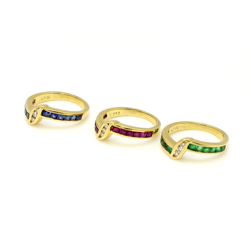Set of 3 Diamond, Sapphire, Emerald and Ruby 18k Gold Ring